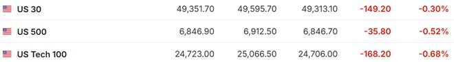| 德国DAX30 | 24,497.83 | 24,672.33 | 24,434.99 | -154.94 | -0.63% | | --- | --- | --- | --- | --- | --- | | 器 英国富时100 | 10,361.10 | 10,403.98 | 10,340.17 | -41.24 | -0.40% | | II 法国CAC40 | 8,257.50 | 8,312.68 | 8,251.72 | -4.66 | -0.06% | | ■ 欧洲斯托克50 | 5,945.96 | 5,999.36 | 5,944.35 | -24.51 | -0.41% | 1. 2月5日(周四)美股盘前,美股三大股指期货齐跌。截至发稿,道指期货跌0.30%,标普500指数期货跌 0.52%,纳指期货跌0.68%。 | US 30 | 49,351.70 | 49,595.70 | 49,313.10 | -149.20 | -0.30% | | --- | --- | --- | --- | --- | --- | | US 500 | 6,846.90 | 6,912.50 | 6 ...