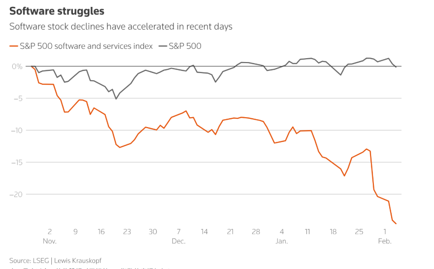 消息面上,美国12月职位空缺意外降至2020年以来最低水平,裁员人数小幅上升,进一步显示企业用工 需求疲软。劳工统计局周四数据显示,12月职位空缺数从11月下修后的693万个降至654万个,低于市场 预期。职位空缺的回落主要来自专业与商业服务业以及零售业,而裁员增加则反映出运输和仓储行业的 裁员规模扩大。招聘人数有所上升,但整体仍处于低位。数据表明,企业在评估自身用工规模和经济活 动前景时,仍对招聘节奏保持谨慎。 此外,有关全球股票市场的"软件股末日"(Software-mageddon)这一悲观叙事论调,正在滚雪球般发酵。 对冲基金正在加大对软件股的做空力度,成为今年以来该领域遭遇惨烈抛售的推手之一; 金融分析公司 S3 Partners的数据显示,对冲基金2026年以来已通过做空软件股斩获240亿美元的收益; 同期美股软件行 业总市值蒸发了1万亿美元。 智通财经APP获悉,周四,美股三大指数集体低开,纳指跌幅扩大至1.6%,明星科技股普跌,谷歌 A(GOOGL.US)、亚马逊(AMZN.US)跌超4%,特斯拉(TSLA.US)、微软(MSFT.US)、美国超微公司 (AMD.US)跌超3%,英伟达(NVD ...