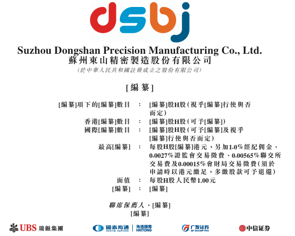 智通财经APP获悉,据港交所11月18日披露,苏州东山精密制造股份有限公司(简称:东山精密, 002384.SZ)递表港交所主板,瑞银集团、海通国际、广发证券和中信证券为其联席保荐人。招股书显 示,东山精密是一家专注于智能制造领域、具备全球化视野与布局的创新驱动型公司。公司从事PCB、 精密组件、触控面板及液晶显示模组及光模块产品的全球设计、生产和销售。根据灼识咨询的资料,以 2024年收入计,公司是全球第一大边缘AI设备PCB供应商、全球第二大软板供应商和全球前三大PCB供 应商。 (テレ发证券 【繼養】 | [編纂]項下的[編纂]數目 : [編纂]股H股(視乎[編纂]行使與否 | | | --- | --- | | 向定) | | | 香港[编纂]數目 | " [编纂]股H股(可予[编纂]) | | 國際[編纂]數目 | : [编纂]股H股(可予[编纂]及視乎 | | [编纂]行使與否而定) | | | 最高[編纂] : 每股H股[编纂]港元,另加1.0%經紀佣金、 | | | 0.0027%證監會交易徵費、0.00565%聯交所 | | | 交易費及0.00015%會財局交易徵費(須於 | | | 申請 ...