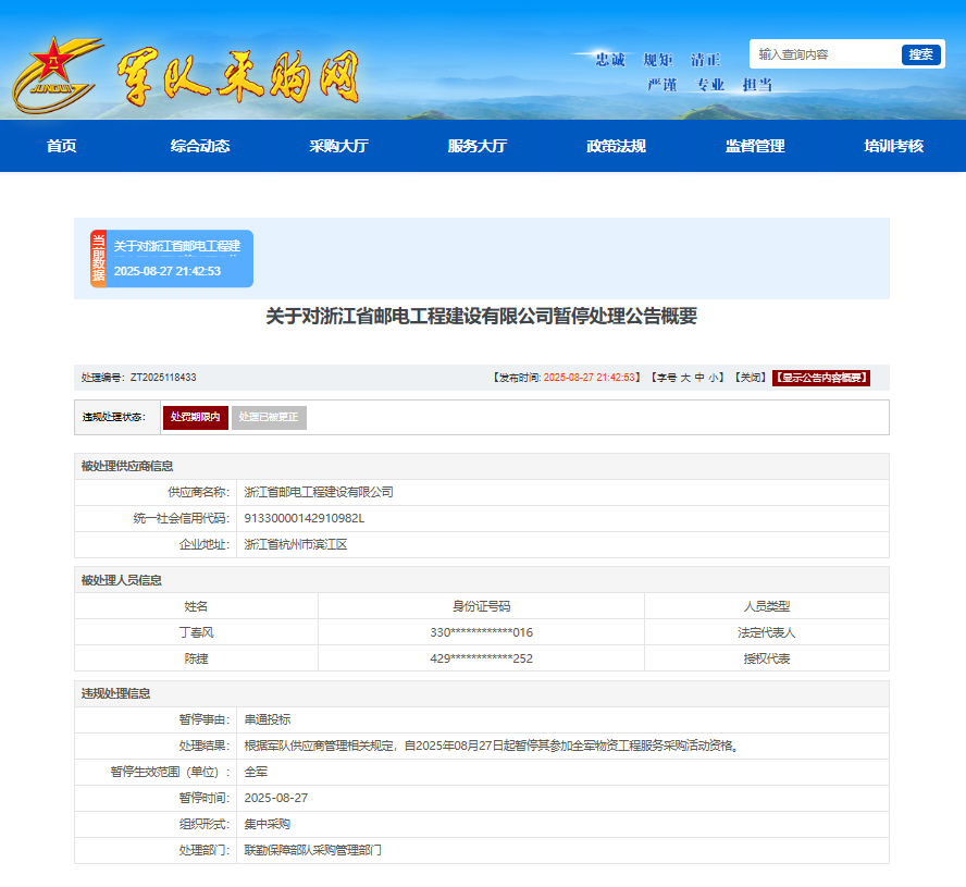 近日,军队采购网发布关于对浙江省邮电工程建设有限公司暂停处理公告。 | | | | | 忠诚 规矩 清正 | 输入查询内容 | 搜索 | | --- | --- | --- | --- | --- | --- | --- | | | | | | 严谨 | 专业 担当 | | | 前 | 综合动态 | 采购大厅 | 服务大厅 | 政策法规 | 监督管理 | 培训考核 | | 处理编号: ZT2025118433 | | | 【发布时间: 2025-08-27 21:42:53】【字号 大 中 小】【关闭】【显示公告内容概要】 | | --- | --- | --- | --- | | 违规处理状态: 处罚期限内 | 处理冒微理正 | | | | 被处理供应商信息 | | | | | 供应商名称: | 浙江省邮电工程建设有限公司 | | | | 统一社会信用代码: | 91330000142910982L | | | | 企业地址: | 区 横出云虎都 浅 | | | | 被处理人员信息 | | | | | 姓名 | | 身份证号码 | 人员类型 | | 丁毒风 | | 330***********016 | 法 ...