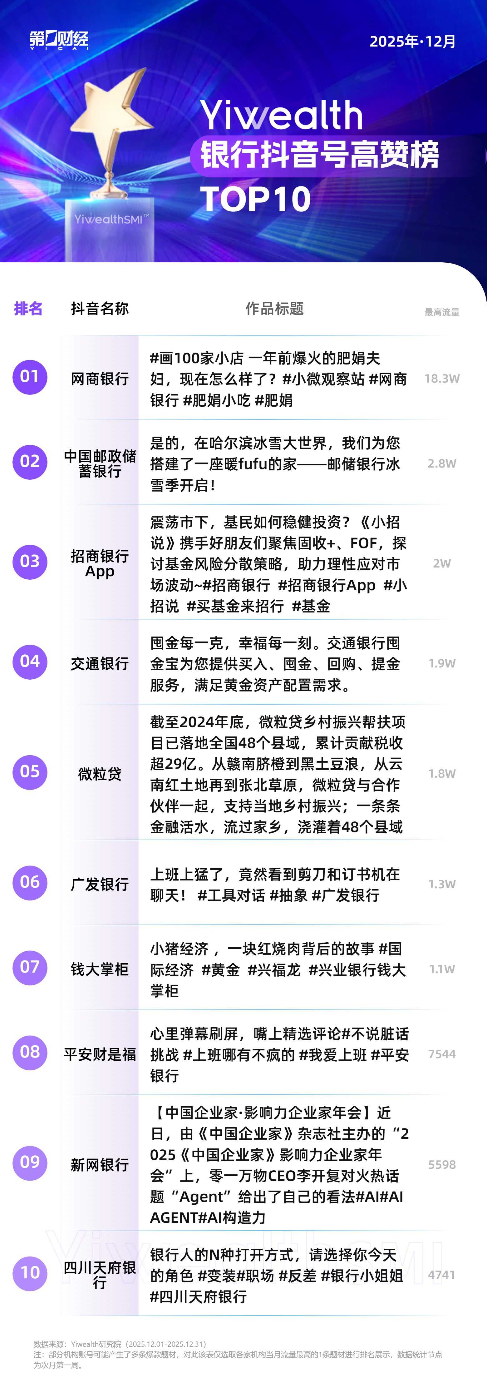 本期为银行社交媒体指数(2025年12月)。 本期为银行社交媒体指数(2025年12月)。 12月银行SMI总榜整体变化不大,仅赣州银行(11月Top19)、郑州银行(11月Top20)掉出榜单,长沙银行(Top13)和泰隆银行(Top18)上榜,名单进出 主要为运营质量较为不稳定的中小城商行。 在12月抖音高赞榜中,虽然网商银行的《画100家小店》依靠"肥娟夫妇"的暖心回访继续稳坐头把交椅,但用户的关注重心较11月已出现明显转变,专业陪 伴内容与抽象整活成为12月内容创作的核心方向。 年末市场震荡背景下,投资者情绪普遍焦虑,专业陪伴类内容顺势成为12月最大的流量黑马。招商银行App精准捕捉基民核心痛点,推出《小招说・朋友 说》系列节目,邀请基金经理与财经媒体人组局交流,以"老友对谈"的轻松形式,深度拆解基金挑选方法、固收+与FOF的核心区别等专业内容。该系列连 续更新五期,平均点赞量达到2万左右,表明在市场波动阶段,能切实缓解用户焦虑的专业干货,远比趣味段子更具传播吸引力。同样的逻辑也体现在兴业 银行钱大掌柜上,他们以"红烧肉"为引子,讲解中国生猪繁育产业从全国统一市场到"南繁北育"的格局变迁,这种让专业知 ...
