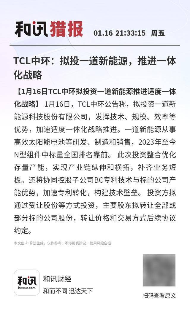 【1月16日TCL中环拟投资一道新能源推进适度一体化战略】1月16日,TCL中环公告称,拟投资一道新 能源科技股份有限公司,发挥技术、规模、效率等优势,加速适度一体化战略推进。一道新能源从事高 效太阳能电池等研发、制造和销售,2023年至今N型组件中标量全国排名靠前。 此次投资整合优化存量 产能,实现产业链纵伸和横拓,补齐业务短板。还将协同控股子公司BC专利技术与标的公司产能优 势,加速专利转化,构建技术壁垒。 投资方拟通过受让股份等方式投资,主要股东拟转让全部或部分 标的公司股份,转让价格和交易方式后续协议约定。 FOG hexun.com 和讯财经 和而不同 迅达天下 本文由 AI算法生成,仅作参考,不涉投资建议,使用风险自担 扫码查看原文 ...