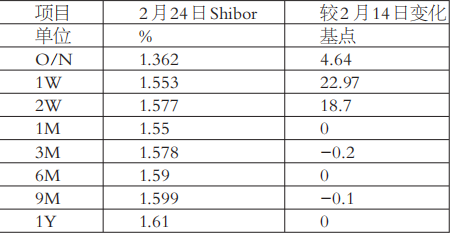 节后首日,资金市场利率呈"短涨长稳"态势。一方面,节后大量逆回购到期,加之企业开启正常生产经 营模式,资金需求上升,短端利率走强;另一方面,节前市场对央行适度宽松货币政策的发言已经有所 反应,节后中长端利率表现相对稳定。截至2月24日,上海银行间同业拆放利率(Shibor)隔夜、1周 期、2周期分别报收于1.362%、1.553%、1.577%,较2月14日分别上升4.64、22.97、18.7个基点;1月 期、6月期、1年期利率分别报收于1.55%、1.59%、1.61%,均与2月14日持平;3月期、9月期分别报收 于1.578%、1.599%,较2月14日分别下降0.2、0.1个基点。 | 项目 | 2月24日Shibor | 较2月14日变化 | | --- | --- | --- | | 单位 | % | 基点 | | 0/N | 1.362 | 4.64 | | 1 W | 1.553 | 22.97 | | 2W | 1.577 | 18.7 | | 1M | 1.55 | 0 | | 3M | 1.578 | -0.2 | | 6M | 1.59 | 0 | | 9M | 1.599 | -0. ...