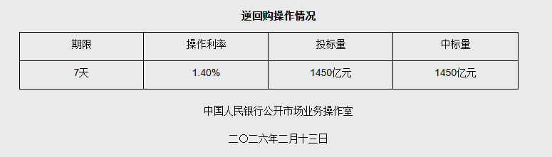 中新网2月13日电据央行网站消息,2026年2月13日中国人民银行以固定利率、数量招标方式开展了1450亿元7 天期逆回购操作。具体情况如下: | 逆回购操作情况 | | | | --- | --- | --- | | 投标量 | 期限 操作利率 | 中标量 | | 1450亿元 | 7天 1.40% | 1450亿元 | | 中国人民银行公开市场业务操作室 | | | | 二〇二六年二月十三日 | | | 图片来源:央行网站截图 (文章来源:中国新闻网) ...