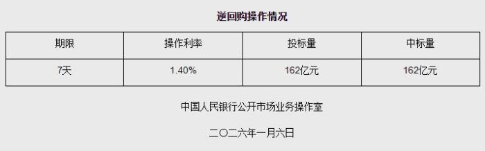 1月6日央行开展162亿元7天期逆回购操作 本文为转载内容,授权事宜请联系原著作权人 中新网1月6日电 据央行网站消息,2026年1月6日中国人民银行以固定利率、数量招标方式开展了162亿 元7天期逆回购操作。具体情况如下: 中新经纬版权所有,未经书面授权,任何单位及个人不得转载、摘编或以其它方式使用。 关注中新经纬微信公众号(微信搜索"中新经纬"或"jwview"),看更多精彩财经资讯。 | | 逆回购操作情况 | | | | --- | --- | --- | --- | | 期限 | 操作利率 | 投标量 | 中标量 | | 7天 | 1.40% | 162亿元 | 162亿元 | 来源:中国新闻网 编辑:付健青 广告等商务合作,请点击这里 截图来自央行网站。 ...