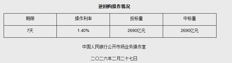 2月27日央行开展2690亿元7天期逆回购操作 图片来源:央行网站截图 来源:中国新闻网 编辑:郭晋嘉 广告等商务合作,请点击这里 本文为转载内容,授权事宜请联系原著作权人 中新经纬版权所有,未经书面授权,任何单位及个人不得转载、摘编或以其它方式使用。 关注中新经纬微信公众号(微信搜索"中新经纬"或"jwview"),看更多精彩财经资讯。 中新网2月27日电 据央行网站消息,2026年2月27日中国人民银行以固定利率、数量招标方式开展了2690亿元 7天期逆回购操作。具体情况如下: | | 逆回购操作情况 | | | | --- | --- | --- | --- | | 崩限 | 操作利率 | 投标量 | 中标量 | | 7天 | 1.40% | 2690亿元 | 2690亿元 | ...