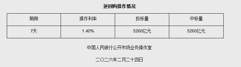 2月24日央行开展5260亿元7天期逆回购操作 中新网2月24日电 据央行网站消息,2026年2月24日中国人民银行以固定利率、数量招标方式开展了5260亿元7 天期逆回购操作。具体情况如下: | 逆回购操作情况 | | | | | --- | --- | --- | --- | | 期限 | 操作利率 | 投标量 | 中标量 | | 7天 | 1.40% | 5260亿元 | 5260亿元 | | 中国人民银行公开市场业务操作室 | | | | | 二〇二六年二月二十四日 | | | | 图片来源:央行网站截图 来源:中国新闻网 编辑:郭晋嘉 广告等商务合作,请点击这里 本文为转载内容,授权事宜请联系原著作权人 中新经纬版权所有,未经书面授权,任何单位及个人不得转载、摘编或以其它方式使用。 关注中新经纬微信公众号(微信搜索"中新经纬"或"jwview"),看更多精彩财经资讯。 ...