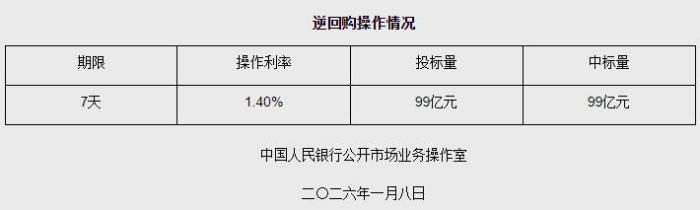 来源:中国新闻网 编辑:付健青 广告等商务合作,请点击这里 | | 逆回购操作情况 | | | | --- | --- | --- | --- | | 期限 | 操作利率 | 投标量 | 中标量 | | 7天 | 1.40% | 99亿元 | 99亿元 | 截图来自央行网站。 1月8日央行开展99亿元7天期逆回购操作 中新网1月8日电 据央行网站消息,2026年1月8日中国人民银行以固定利率、数量招标方式开展了99亿 元7天期逆回购操作。具体情况如下: 本文为转载内容,授权事宜请联系原著作权人 中新经纬版权所有,未经书面授权,任何单位及个人不得转载、摘编或以其它方式使用。 关注中新经纬微信公众号(微信搜索"中新经纬"或"jwview"),看更多精彩财经资讯。 ...