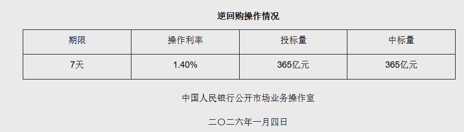 1月4日央行开展365亿元7天期逆回购操作 图片来源:央行网站截图 来源:中国新闻网 编辑:付健青 广告等商务合作,请点击这里 中新网1月4日电 据央行网站消息,2026年1月4日中国人民银行以固定利率、数量招标方式开展了365亿元7天期逆回购操作。具体情 况如下: 本文为转载内容,授权事宜请联系原著作权人 | 期限 | 逆回购操作情况 操作利率 | 投标量 | 中标量 | | --- | --- | --- | --- | | 7天 | 1.40% | 365亿元 | 365亿元 | | | 中国人民银行公开市场业务操作室 二〇二六年一月四日 | | | 中新经纬版权所有,未经书面授权,任何单位及个人不得转载、摘编或以其它方式使用。 关注中新经纬微信公众号(微信搜索"中新经纬"或"jwview"),看更多精彩财经资讯。 ...