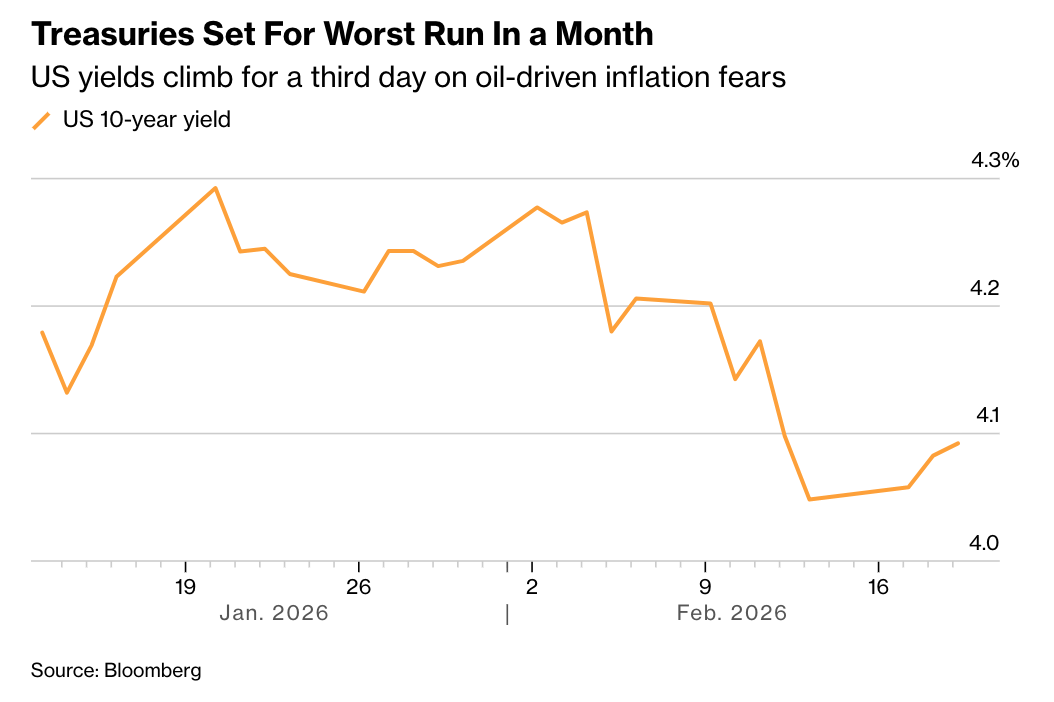来源:智通财经网 随着美伊紧张局势加剧引发油价走高将推动通胀的担忧,美国国债正迈向一个月来最长的连跌走势。数据显示,美国10年期国债收益率连续第三日上 升,上涨1个基点至4.09%。油价周四上涨,延续前一日的涨势。 知情人士透露,美军已做好"最早于本周末对伊朗发动军事打击"的准备,但美国总统特朗普尚未最终决定。消息人士称,白宫已获悉,在近几日美军 向中东大幅增兵后,军方已做好周末发动攻击的准备。特朗普就军事行动的利弊私下进行过辩论,并就最佳行动方案征询了顾问和盟友的意见——目 前尚不清楚他是否会在周末前做出决定。 美国和伊朗第二轮间接谈判2月17日在瑞士日内瓦举行。美伊官员在谈判结束后均表示,尽管分歧仍存,但谈判较上一轮取得进展,双方同意继续接 触。 在美国与伊朗进行间接谈判的同时,美国不断在伊朗周边强化军事部署。美国海军"福特"号航母及其护航舰艇正在穿越大西洋,前往直布罗陀海峡。 另外,美国还向中东派遣了大量战斗机和支援机群,集结自2003年伊拉克战争以来该地区最大规模的空中力量。 美联储会议纪要显示,官员们对未来的货币政策方向存在分歧。在评估货币政策前景时,一些与会者表示,如果通胀如预期般回落,进一步下调 ...