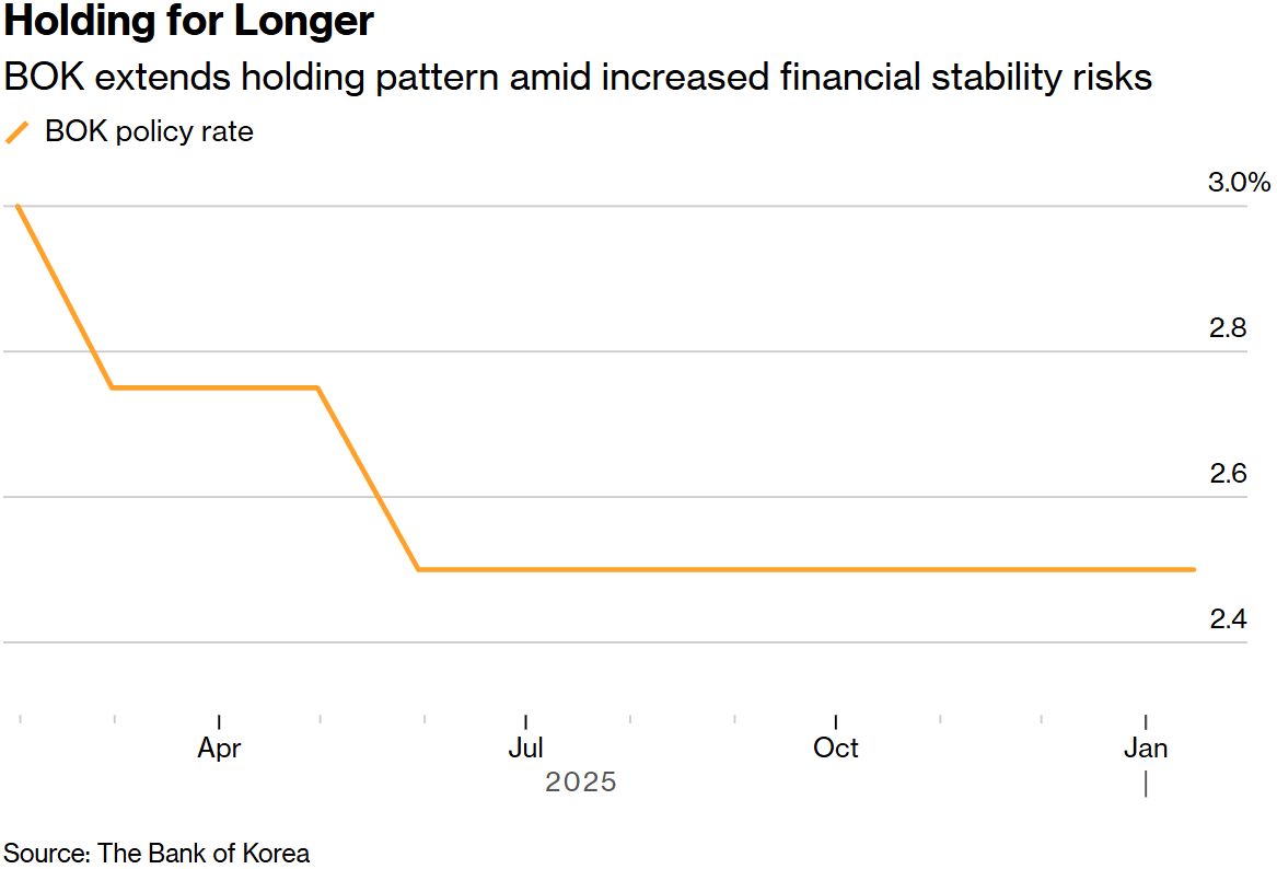 智通财经APP获悉,由于当局在监测韩元贬值以及金融失衡风险,韩国央行周四宣布维持基准利率不变,这一举动符合市场普遍预期。韩国央行在周四的会 议上连续第五次将七天回购利率维持在 2.5% 不变,该行还在声明中删除了关于潜在降息的表述,向中性立场倾斜。 这一决定与调查的所有 21 位经济学家的预期一致。自 2024 年 10 月以来,韩国央行曾四次下调利率,而此次决定延续了自去年 7 月开始的政策暂停期。 周四的会议延续了委员会在 11 月表现出的中性姿态,当时其在声明中删除了关于维持降息立场的措辞。行长李昌镛当时表示,官员们对于三个月内是否降 息,还是维持利率不变的意见不一。他表示,目前的政策利率已经接近既不具有限制性也不具有刺激性的水平。 尽管决策者一方面关注支持经济,但近期他们将更多注意力集中在防范与房地产市场和走弱的本币相关的金融市场不稳定。 韩元是今年亚洲表现最差的货币,这增加了进口成本上升导致通胀加速的风险。美国财政部长斯科特·贝森特在华盛顿会见韩国副总理兼企划财政部长官具 润哲时强调了这一变动。 韩国央行在金融稳定风险加剧的情况下延长稳定策略 韩国央行在声明中表示:"随着通胀预计将逐步稳定,经济增长 ...