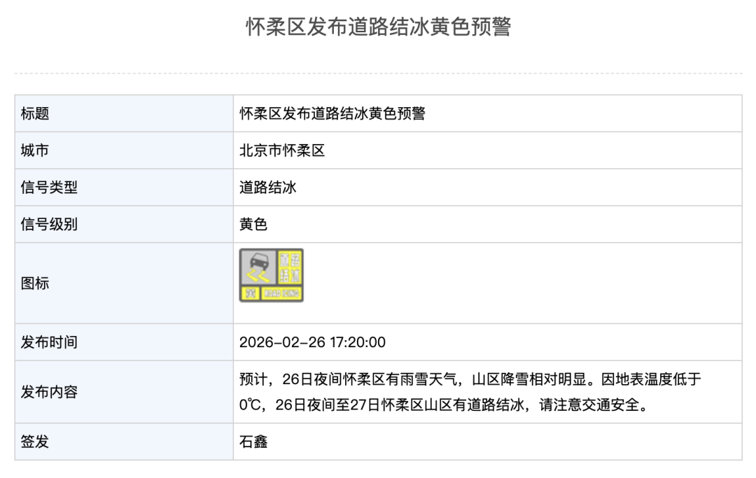 北京市气象台2月26日20时发布 :今天夜间阴有雨夹雪或雪(山区小到中雪),偏南风一二级,最低气温-1℃;明天白天阴转多云,偏南风二三级,最高 气温7℃。今天夜间自西向东有雨雪天气,西部山区较明显,出行请注意交通安全。 延庆佛爷顶下雪了—— 朝阳出现飘雪—— 截至目前,怀柔区、延庆区、昌平区、门头沟区、密云区、房山区气象台发布道路结冰黄色预警信号。 密云区发布道路结冰黄色预警 | 标题 | 密云区发布道路结冰黄色预警 | | --- | --- | | 城市 | 北京市密云区 | | 信号类型 | 道路结冰 | | 信号级别 黄色 | | | 图标 | | | 发布时间 | 2026-02-26 21:15:00 | | 发布内容 | 预计,26日夜间密云区有雨雪天气。因地表温度低于0℃,26日夜间至27日密 | | | 云区可能出现道路结冰,其中山区结冰风险较高,请注意交通安全。 | | 签发 甘璐 | | | 标题 | 门头沟区发布道路结冰黄色预警 | | --- | --- | | 城市 | 北京市门头沟区 | | 信号类型 | 道路结冰 | | 信号级别 | 黄色 | | 图标 | | | 发布时间 ...