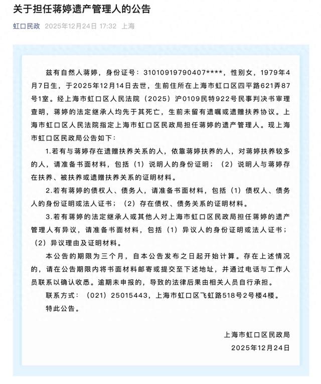 转自:北京日报客户端 12月14日,上海一位46岁未婚、无子女、独居的蒋女士因突发脑溢血昏迷两个月后离世,其远房表弟在 处理身后事时遭遇遗产使用难题,引发社会对于意定监护、遗嘱等问题的关注。 12月24日,上海市虹口区民政局发布公告称,受上海市虹口区人民法院指定,将担任蒋婷的遗产管理 人。 公告全文如下—— 兹有自然人蒋婷,身份证号:31010919790407****,性别女,1979年4月7日生,于2025年12月14日去 世,生前住所在上海市虹口区四平路621弄87号1室。经上海市虹口区人民法院(2025)沪0109民特922 号民事判决书审理查明,蒋婷的法定继承人均先于其死亡,生前未留有遗嘱或遗赠扶养协议。上海市虹 口区人民法院指定上海市虹口区民政局担任蒋婷的遗产管理人。现上海市虹口区民政局公告如下: 1.若有与蒋婷存在遗赠扶养关系的人,依靠蒋婷扶养的人,对蒋婷扶养较多的人,请准备书面材料,包 括(1)说明人的身份证明;(2)说明人与蒋婷存在扶养、被扶养或遗赠扶养关系的证明材料。 2.若有蒋婷的债权人、债务人,请准备书面材料,包括(1)债权人、债务人的身份证明或法人证书; (2)存在债权、债务关系的证 ...