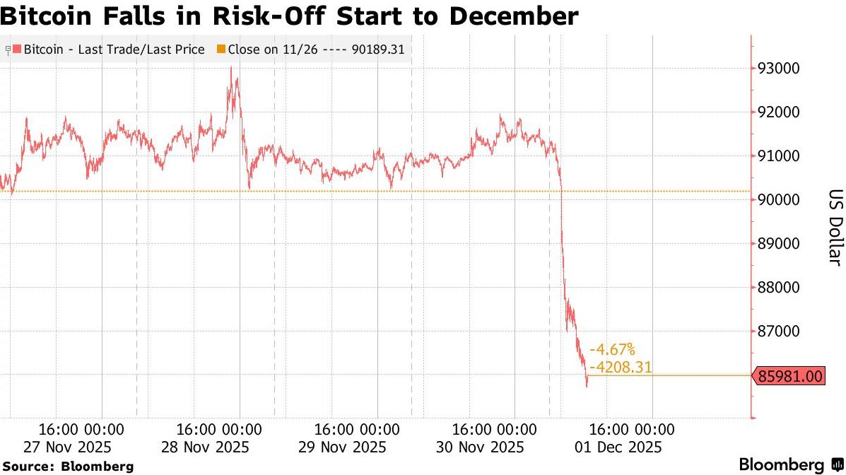 12月开局避险情绪弥漫 比特币跌超6%失守86,000美元