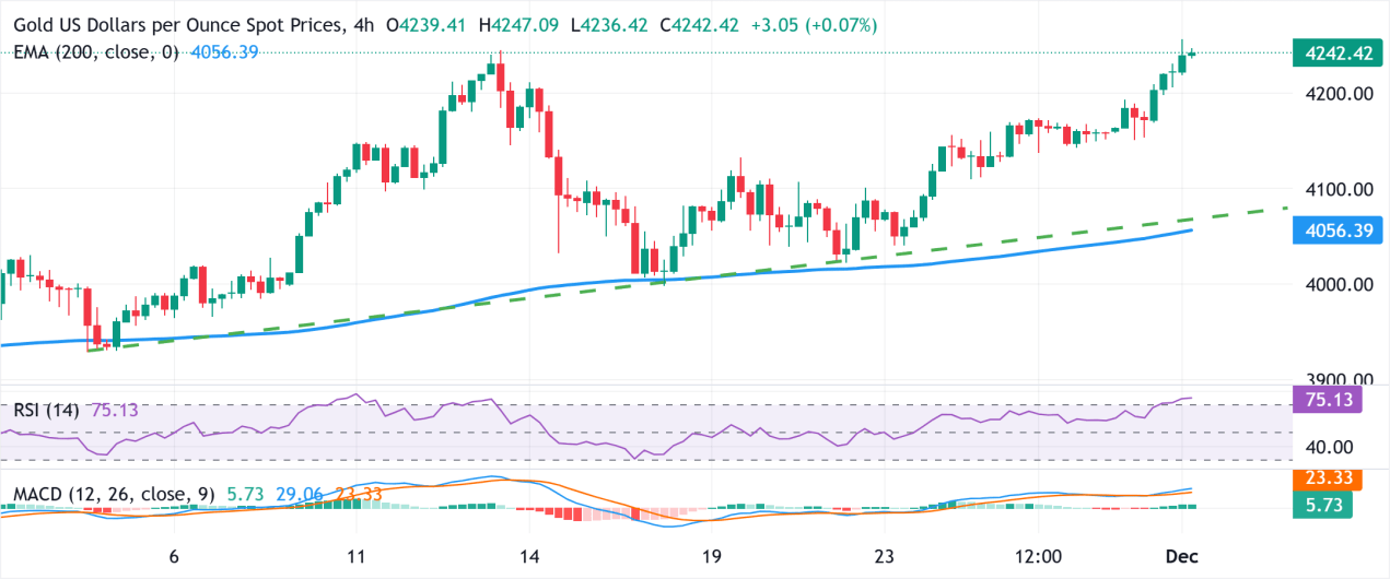 周一(12月1日)欧盘时段,伦敦金目前交投于4242一线上方,截至发稿,伦敦金暂报4250.59美元/盎司, 上涨0.50%,最高触及4256.20美元/盎司,最低下探4205.33美元/盎司。目前来看,伦敦金短线偏向上涨 走势。 【要闻速递】 法国兴业银行利率策略师在一份报告中表示,即将公布的经济数据应会继续显示美国经济具有韧性、通 胀具有粘性,以及劳动力市场状况略有恶化;尽管如此,到2026年底,美国国债收益率仍有下降空间。 摘要周一(12月1日)欧盘时段,伦敦金目前交投于4242一线上方,截至发稿,伦敦金暂报4250.59美元/盎 司,上涨0.50%,最高触及4256.20美元/盎司,最低下探4205.33美元/盎司。目前来看,伦敦金短线偏向 上涨走势。 与此同时,中东局势显着升级,黎巴嫩真主党高级领导人在以色列空袭中身亡,这一事件加剧了该地区 的局部动荡。11月底普京首度公开谈和平计划,准备下周同美方"严肃"讨论。当前美俄乌会谈仍存极大 不确定性,密切关注。 【最新伦敦金行情解析】 从4小时图分析,价格的主要支撑已上移至4200美元整数关口附近,该位置是判断短期强势能否延续的 首要防线。更为精确的多头 ...