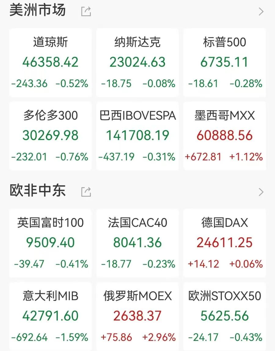 视频丨柳润瑛 美股三大指数周四集体收跌,英伟达股价创历史新高。纳斯达克中国金龙指数收跌2.03%,热门中概股多数下跌。 黄金、白银也结束了价格一路飙升的态势,COMEX黄金期货收跌1.95%,COMEX白银期货收跌2.73%。国际油价下跌,ICE布 油、NYMEX WTI原油均跌逾1%。 | 美洲市场 [^ | | | | --- | --- | --- | | 道琼斯 | 纳斯达克 | 标普500 | | 46358.42 | 23024.63 | 6735.11 | | -243.36 -0.52% -18.75 -0.08% -18.61 -0.28% | | | | 多伦多300 | 巴西IBOVESPA | 墨西哥MXX | | 30269.98 | 141708.19 | 60888.56 | | -232.01 -0.76% -437.19 -0.31% +672.81 +1.12% | | | | 欧非中东 区 | | | | 英国富时100 法国CAC40 | | 德国DAX | | 9509.40 | 8041.36 | 24611.25 | | -39.47 -0.41% -18.77 ...