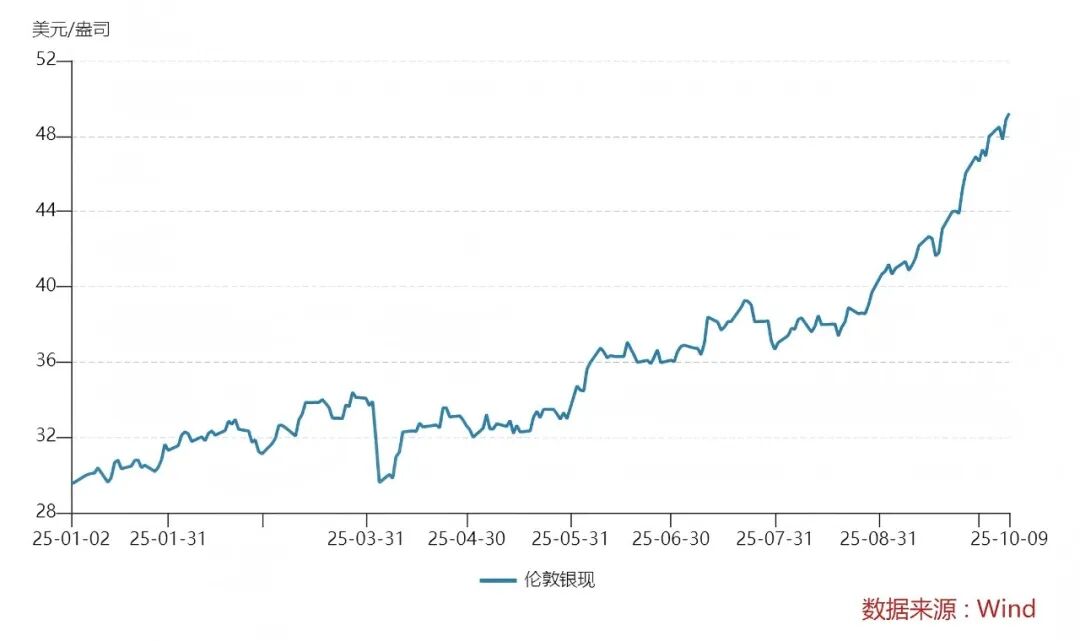 Core Viewpoint - The price of silver has reached a historic high, driven by increased demand for safe-haven assets and tightening supply in the London spot market [1][3]. Group 1: Price Movement - On October 9, the spot silver price surged to over $50 per ounce, marking the highest level since the "Hunt Brothers squeeze" in the 1980s [1]. - The price continued to rise, reaching $51.06 per ounce, with a daily increase of 4.5% [1]. - Year-to-date, silver has appreciated over 70%, outperforming gold, which has also reached historical highs [3]. Group 2: Market Dynamics - Concerns regarding U.S. fiscal risks, an overheated stock market, and threats to the independence of the Federal Reserve have led investors to seek safe-haven assets [3]. - A shortage of freely available silver in the London market has supported prices and significantly increased the cost of borrowing silver [3][6]. - The current silver futures price on the New York Mercantile Exchange (Comex) remains below the historical record of $50.35 per ounce set in January 1980 [4]. Group 3: Industrial Demand and Supply Outlook - Silver is widely used in industrial applications, including solar panels and wind turbines, which together account for over half of silver consumption [6]. - The silver market is expected to experience a supply deficit for the fifth consecutive year by 2025 [6]. - The tightness in the London silver market is nearing unprecedented levels, with high borrowing costs for the metal [6]. Group 4: Historical Context and Speculation - The recent surge in silver prices has parallels to past spikes in 2011 and 2020, with the latter seeing a 140% increase in less than five months [7]. - Historical speculation by the Hunt Brothers in 1980 led to a significant price increase, which subsequently collapsed, illustrating the volatility of the silver market [7].