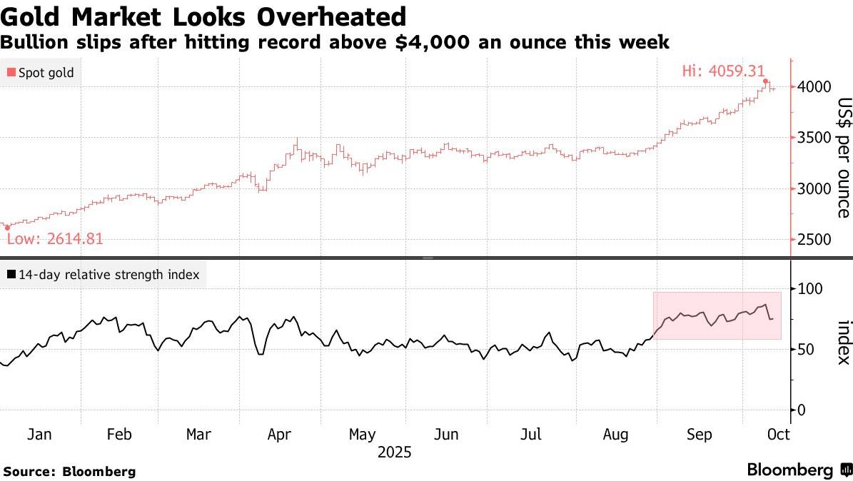 近期贵金属上涨得益于"货币贬值交易"推动,投资者涌入比特币、黄金、白银等被视为安全资产的品种,同时撤离美元等主要货币。对通胀压力、美国财政 不可持续及美联储独立性受威胁的担忧,持续推升贵金属吸引力。 截至发稿,现货黄金价格维持3987美元/盎司附近,彭博美元指数在上一交易日触及10周高点后基本持平;白银则下跌0.2%,周四曾上涨4.8%。 图2 智通财经APP获悉,黄金价格在前一交易日跌破每盎司4000美元关口后企稳,周五收盘报每盎司3987.04美元,较前一日下跌1.6%。此前金价连续四日快速 上涨,周三曾创下每盎司4059.31美元的历史新高,但技术指标显示过去一个月金价多数时间处于超买状态,促使部分投资者选择获利了结。与此同时,白 银价格延续跌势,周四触及每盎司51.235美元的40多年新高后回落,尽管今年以来白银累计涨幅仍达约70%,远超黄金同期表现。 图1 此次贵金属波动恰逢周四美国股市下跌,尽管黄金通常被视为市场动荡期的避险资产,但当投资者需平仓弥补其他市场损失时,黄金也可能与风险资产同步 下跌。不过,金价仍有望实现连续第八周上涨。 Pepperstone Group研究主管克里斯·韦斯顿指出,在 ...