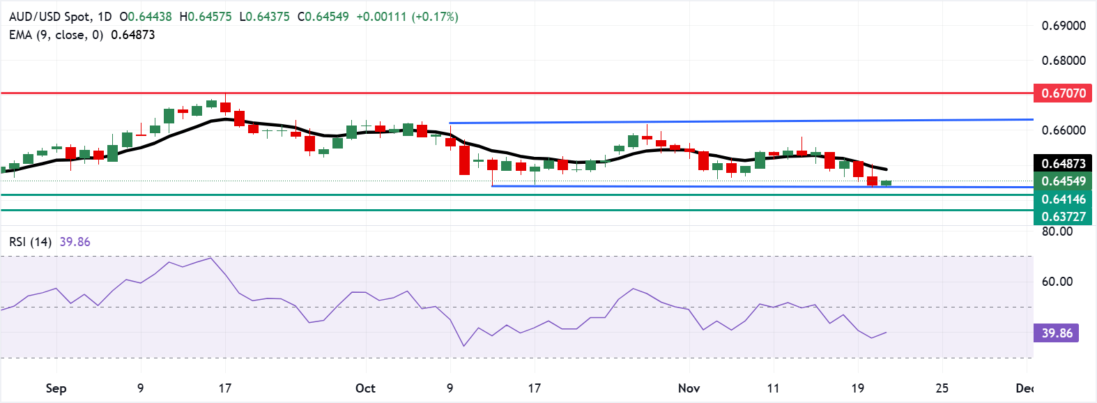 澳大利亚元对美元汇率在周五出现上涨,此前该货币对连续两日走低。 这一变化与澳大利亚标准普尔全球采购经理人指数(PMI)初值公布后的市场反应相关。数据显示,11月澳大利亚标普全球制造业PMI为51.6,高于此前的 49.7;服务业PMI从52.5升至52.7,综合PMI则从52.1上升至52.6。 市场对澳大利亚储备银行(RBA)政策立场的预期呈现谨慎倾向。RBA会议记录显示,若经济数据持续优于预期,该行可能在较长一段时间内维持利率不 变。RBA助理行长萨拉·亨特(SarahHunter)近期表示,持续高于趋势的经济增长可能加剧通胀压力,但央行不会对单月通胀数据做出即时反应,因月度数 据可能存在波动。 技术面上,AUD/USD仍处于横向整理区间 截至11月18日,ASX30天银行现金利率期货显示,2025年12月合约交易于96.41,对应RBA下次董事会会议调整利率(从3.60%至3.35%)的概率约为8%。 汇价在前一日于0.6450 附近运行,整体保持在一个矩形区间内震荡。短线价格仍位于9 日均线下方,显示动能偏弱。 美元兑人民币汇率走低,市场对美联储调整利率的预期有所升温。美元指数(DXY)结束五连阳走势 ...