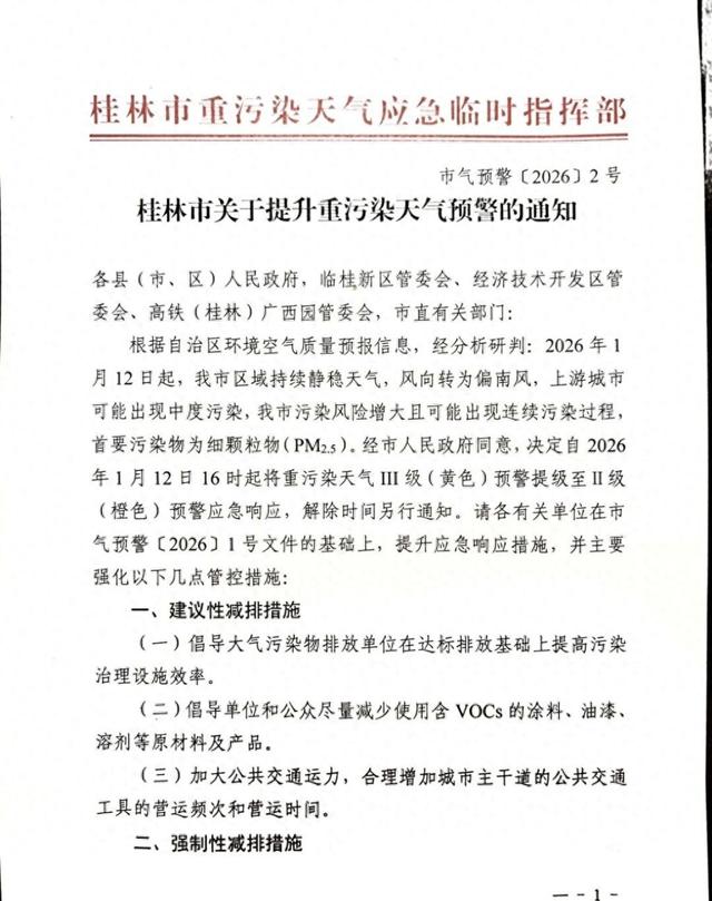 2026年1月13日,广西桂林发布通知,将重污染天气川级(黄色)预警提级至 II级(橙色)预警应急响应。 桂林市重污染天气应急临时指挥部 市气预警〔2026〕2号 桂林市关于提升重污染天气预警的通知 各县(市、区)人民政府,临桂新区管委会、经济技术开发区管 委会、高铁(桂林)广西园管委会,市直有关部门: 根据自治区环境空气质量预报信息,经分析研判:2026年1 月 12日起,我市区域持续静稳天气,风向转为偏南风,上游城市 可能出现中度污染,我市污染风险增大且可能出现连续污染过程, 蓄要污染物为细颗粒物(PM2.s)。经市人民政府同意,决定自 2026 年1月12日 16时起将重污染天气 III 级(黄色)预警提级至II 级 (橙色)预警应急响应,解除时间另行通知。请各有关单位在市 气预警〔2026〕1号文件的基础上,提升应急响应措施,并主要 强化以下几点管控措施: 一、建议性减排措施 (一)倡导大气污染物排放单位在达标排放基础上提高污染 治理设施效率。 (二)倡导单位和公众尽量减少使用含 VOCs 的涂料、油漆、 溶剂等原材料及产品。 (三)加大公共交通运力,合理增加城市主干道的公共交通 工具的营运频次和管运 ...