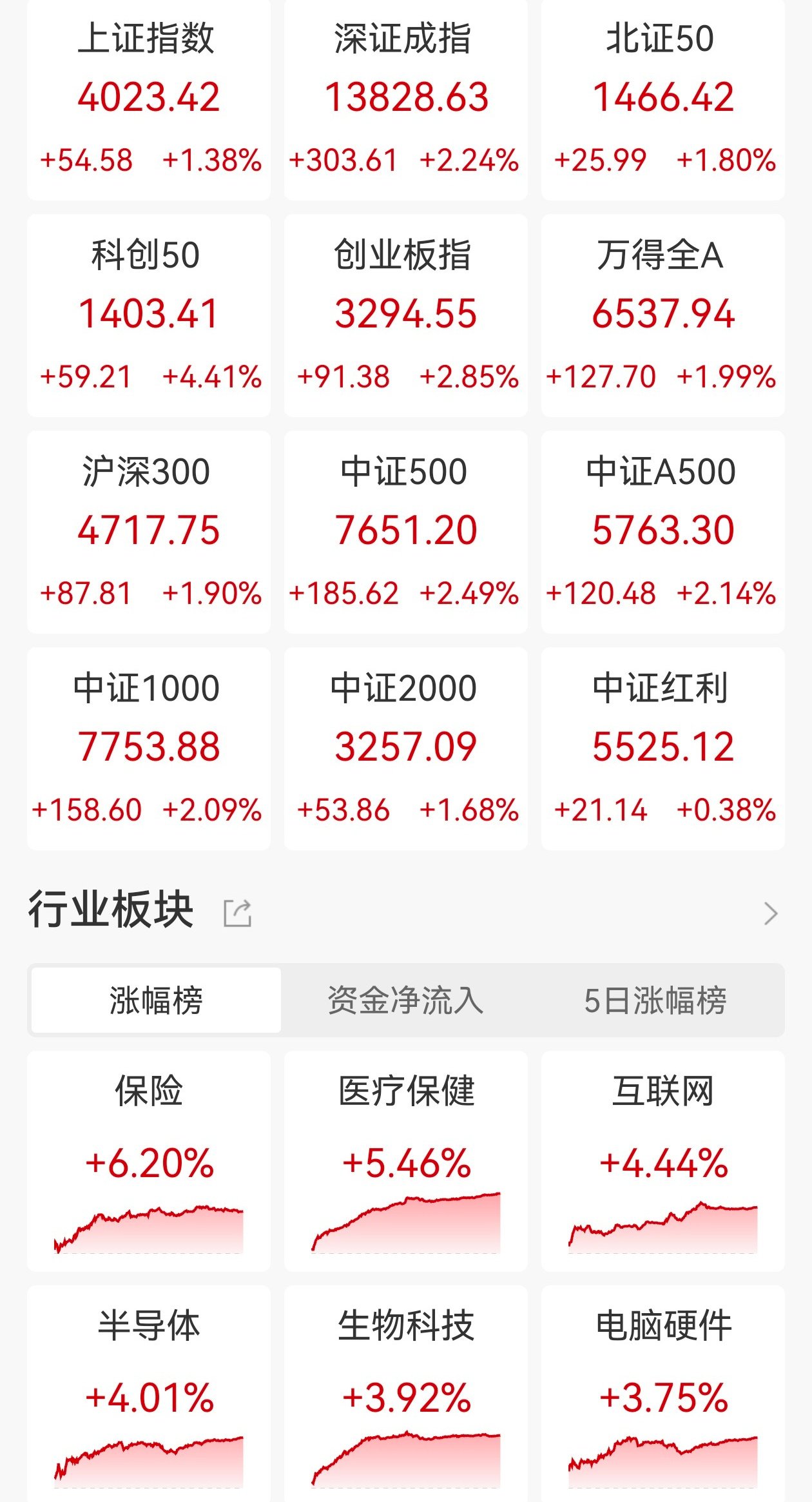 盘面上,马斯克计划2026年大规模量产脑机接口设备,脑机接口板块掀涨停潮,道氏技术、三博脑科及乐普医疗等20股涨停;保险股大涨,新华保险涨超 8%;医疗器械板块走高,赛诺医疗等多股涨停;AI芯片、存储芯片板块拉升,普冉股份、恒烁股份涨停;重组蛋白、快手概念、CRO、游戏及Sora概念等 涨幅居前。另外,海南、免税板块逆市下跌,海汽集团、海南发展领跌;旅游酒店板块走低,凯撒旅业跌近7%;铁路公路、电机及航空机场等板块跌幅居 前。(格隆汇) | 上证指数 | 深证成指 | 北证5( | | --- | --- | --- | | 4023.42 | 13828.63 | 1466.4 | | +54.58 +1.38% +303.61 +2.24% +25.99 +1 | | | | 科创20 | 创业板指 | 万得全/ | | 1403.41 | 3294.55 | 6537.9 | | +59.21 +4.41% +91.38 +2.85% +127.70 +1 | | | | 沪深300 | 中证500 | 中证A5( | | 4717.75 | 7651.20 | 5763.3 | | +87.81 +1 ...