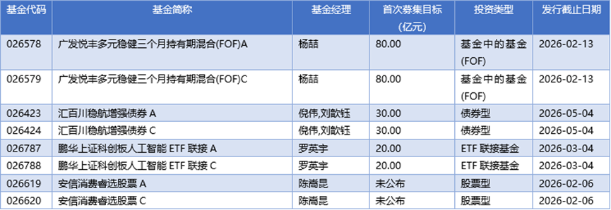 一、交易提示 面对债券底仓收益下降、权益增强难度上升的双重压力,多家券商资管表示,2026年将重点布局"固收+"产品,通过多资产 配置、量化工具运用和风控体系升级推进策略迭代。展望股债走势,机构普遍认为,今年债券收益率水平将维持震荡,权 益市场有望在震荡中走强,"固收+"产品将借助可转债、量化对冲、衍生品等工具提升收益弹性,满足居民资产向金融资产 配置转移的需求。 数据来源:巨灵财经 基金频道更多独家策划、专家专栏,免费查阅>> 责任编辑:栎树 (3)春节前后,债券、指数、主动权益等多类型基金密集公告暂停大额申购。受访人士归纳:一是保护存量持有人利益, 避免大额资金摊薄收益;二是维护策略有效性,防止规模快速膨胀冲击模型或建仓节奏;三是应对节前流动性波动,降低 赎回冲击成本。投资者选基需兼顾管理人投研实力与自身风险偏好,避免盲目追逐短期业绩。 | 基金代码 | 基金简称 | 基金经理 | 首次蔡集目标 | 投资类型 | 发行截止日期 | | --- | --- | --- | --- | --- | --- | | | | | (亿元) | | | | 026578 | 广发悦丰多元稳健三个月持有期混合(FOF ...