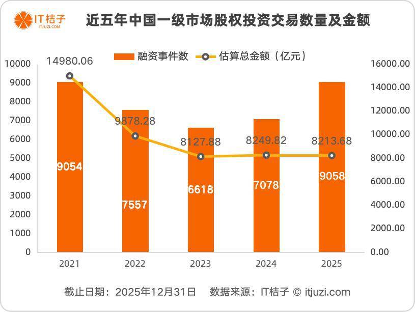 请回答中国创投 2025:市场回暖还是降温 ? 第一个数字:投资交易数量增长 28% 如果要用一个词来概括 2025 年的创投市场," 走出寒冬 " 可能是最贴切的表达。 经历了 2022 年和 2023 年的持续降温后,2025 年的创投市场终于迎来了强劲反弹,交易数量创下近五年新高。但与 此同时,投资总金额却保持平稳,没有跟随交易数量同步增长。 这种 " 量增额稳 " 的独特现象,揭示了当下创投市场的真实面貌。 三个关键数字告诉你答案 要判断 2025 年创投市场的冷热,我们先来看三组最直观的对比数据。 2025 年,中国新经济一级市场共发生 9058 起投资交易,比 2024 年的 7078 起增加了 1980 起,增幅高达 28%。 这个增长幅度相当显著——相当于平均每天多发生 5 起投资事件。 更值得注意的是,2025 年的交易数量不仅超过了 2024 年,甚至超过了 2021 年的 9054 起,成为近五年来交易最活 跃的一年。 第二个数字:投资总金额下降 0.44% 虽然交易数量大幅增长,但投资总金额却基本持平。 2025 年投资总金额为 8213.68 亿元,比 2024 年的 8249.82 ...
