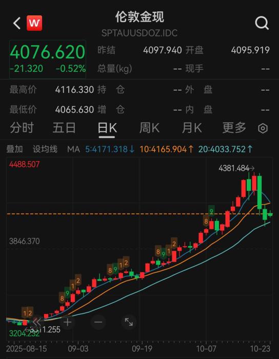 Core Viewpoint - International gold prices have recently reached historical highs, but have experienced a pullback due to concerns over an overheated market, dropping to around $4,000 per ounce [1][3]. Group 1: Price Movements - On October 22, the London spot gold price approached $4,000 per ounce, and by October 23, it was around $4,090 per ounce [3]. - Gold prices have increased approximately 55% this year, supported by market expectations of a Federal Reserve interest rate cut by at least 0.25% before the end of the year [3]. Group 2: Market Analysis - Analysts suggest that the recent decline in gold prices is a technical correction rather than a fundamental shift, as prices remain above $4,000 [3]. - Profit-taking by investors is identified as a significant reason for the recent drop in gold prices [3]. - The decline in precious metal prices may reflect profit-taking and a reduction in safe-haven flows, rather than movements in U.S. Treasury yields [4]. Group 3: Investor Sentiment - Long-term investors and hedge funds, such as Crescat Capital, view the recent pullback as a healthy correction, indicating that the factors driving gold prices higher are still in place [3]. - Continued macroeconomic uncertainty and low U.S. Treasury yields are expected to provide potential support for gold prices [4].