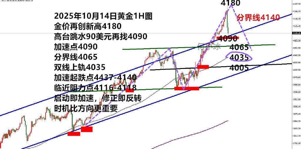 来源:黄金9点钟何小冰 何小冰:金价再创新高后高台跳水,4140是接下来的重点 哈喽,金价新的历史高点4180区域 没错,41开头的金价了,上周后半周深蹲3944确定支撑后,又一波将近240美元的上涨 今日周二早盘延续上涨,持续突破新高,午后直接高台跳水,从4180区域直接跳下去,扫荡式下跌,加速跌至4090区域 而4090位置是昨晚凌晨最后回踩确定支撑点和起涨点,也是上升通道线的上轨位置 此处将是今日的关键,跌破此处,下一个位置关注4065的分界线 然后也是最为重要的小时图双线上轨位置4035区域 所以,回到我们最初提及的问题:一个位置,配合两道分界线,共同去定空间,架构不变,点位变了 现在这个位置变成成了4090 第一个分界线是小时图双线上轨,现在在4035区域,靠近四小时生命线位置,作为多空主导权分界线 第二个分界线是上升通道区间,现在是4090-3980,主要分界线位置是上轨位置,从而进行下一步的空间切换 因此,参考这三点,注意4090的分界线位置,若是价格跌回4090以下,首先考虑跌回上升通道区间4090-3980区域,然后关注小时图双线上轨4035 得失,然后再进一步切换空间 1、拉升上涨幅度相似 ...
