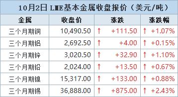 伦敦时间10月2日17:00(北京时间10月3日00:00),LME三个月期铜上涨111.5美元,或1.07%,收报每吨 10,490.5美元,盘中触及10,531美元的去年5月以来最高价位。 10月2日(周四),伦敦金属交易所(LME)铜价攀升至16个月最高,受助于供应干扰引发的短缺担 忧, | | 10月2日 LIE基本金属收盘报价(美元/吨) | | | --- | --- | --- | | 金屋 | 收盘价 | 张跃 张默帽 | | 三个月期铜 | 10,490.50 | +111.50 +1.07% | | 三个月期铝 | 2,692.50 1 | +4.00 ↑ +0.15% | | 三个月期锌 | 3,020.50 ↑ | +32.90 ↑ +1.10% | | 三个月期铅 | 2,024.00 ↑ | +13.50 ↑ +0.67% | | 三个月期镇 | 15,317.00 1 | +133.00 ↑ +0.88% | | 三个月期锡 | 36.888.00 1 | +875.00 ↑ +2.43% | 数据来源:文华财经 有关供应的最新消息来自印尼,自由港(Freeport-McMoRa ...