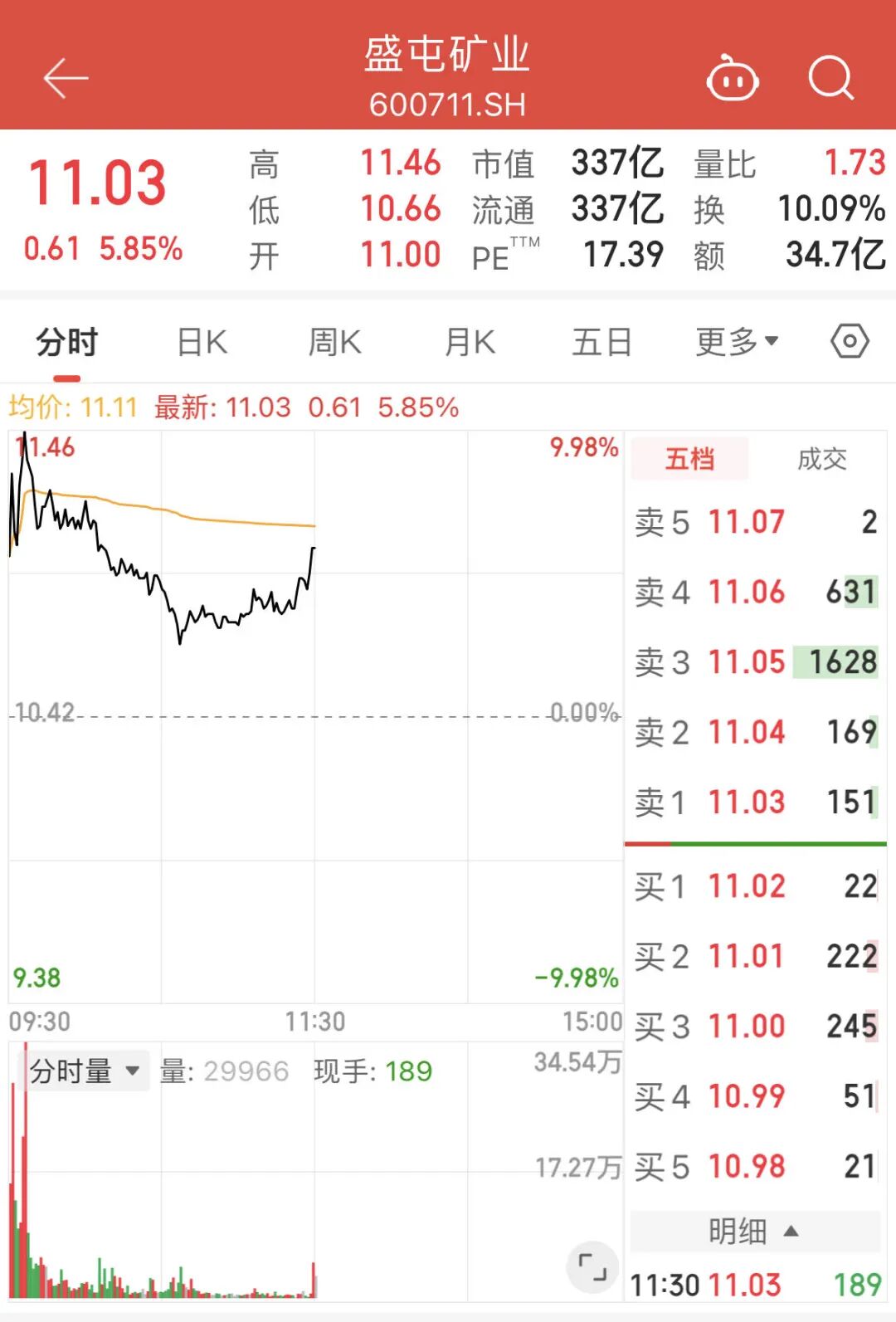 10月15日,盛屯矿业(600711.SH)盘中一度涨停,截至收盘,报11.03元/股,涨幅收窄至5.85%。 | 盛屯矿业 | | | | | | | | --- | --- | --- | --- | --- | --- | --- | | 600711.SH | | | | | | | | 들 11.03 | | 11.46 市值 | | 337亿 量比 1.73 | | | | ਜ਼ਿੰ | | 10.66 流通 | 337亿 换 | | 10.09% | | | 0.61 5.85% 开 | | 11.00 PE " | 17.39 额 | | 34.7亿 | | | 目K 分时 園K | 日K | | 更多。 五日 | | | | | 均价: 11.11 最新: 11.03 0.61 5.85% | | | | | | | | 1.46 | | | 9.98% 五档 | 成交 | | | | | | | 卖5 11.07 | 2 | | | | -10.42. | | | 卖4 11.06 631 0.00% | | | | | | | | 卖3 11.05 1628 | | | | | | | ...
