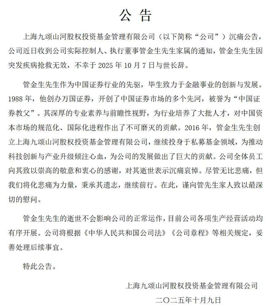 专题:九颂基金公司实际控制人管金生去世 炒股就看金麒麟分析师研报,权威,专业,及时,全面,助您挖掘潜力主题机会! 10月9日晚,上海九颂山河股权投资基金管理有限公司(简称"九颂基金")公告,近日收到实际控制 人、执行董事管金生家属的通知,管金生因突发疾病抢救无效,不幸于2025年10月7日与世长辞。 1947年,管金生出生于江西省清江县(今樟树市)。青年时代,他以优异成绩考入上海外国语学院,主 修法语;后赴比利时布鲁塞尔自由大学深造,并获得工商管理硕士学位。 1980年代初,改革春潮拍岸,管金生从外语与涉外事务的岗位转入金融业。1982年进入上海国际信托; 1988年,管金生受命筹建中国最早的现代券商之一——万国证券。该公司由上海国际信托投资公司等10 家股东共同出资3500万元人民币成立,管金生出任副董事长、总经理兼总裁。 1990年上海证券交易所成立时,其交易规则、设备、交易员的培训等都有万国证券的参与。深沪两地的 异地交易首先由万国证券开通;无纸化交易也由万国证券率先推动。 少年出乡关:从外语到金融的跨越 责任编辑:刘万里 SF014 到1992年,万国证券已成长为一家具有国际影响力的公司。彼时,管金生 ...
