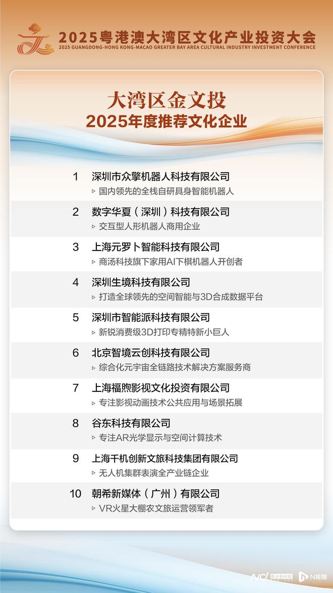 大湾区文投会高水平搭建"为资金找项目,为项目找资金"平台,吸引超过100家知名金融投资机构的200 多名投资人到会。本次评选立足湾区,面向全国,对重点投资文化产业领域的200多家投资机构按照基 金规模、投资项目数量及文化产业投资成功案例等规则进行筛选,最终选出24家投资机构为"大湾区金 文投2025年度推荐投资机构",具体名单如下: 本届文投会创新组织"1+8+N"系列活动,即1场主题大会,8场专场投融资路演以及多场配套服务活动, 并创新采用了"3+365"的办会模式,力图成为投资机构和文化企业的"超级联系人"。累计超过300个文化 企业(项目)报名参会,大会组委会邀请专家共同评选出具备显著文化代表性、科技前沿性以及发展潜 力的创新型文化企业,共有10家企业入选"大湾区金文投2025年度推荐文化企业",具体名单如下: 此外,本次评选还针对大湾区内的产业园区进行评选,具有显著文化产业属性、建筑面积规模在3万平 方米以上的文化产业园区可参与评审。组委会共收到报名园区52个,经过评审最终选出9个园区为"大湾 区金文投2025年度推荐文化园区",具体名单如下: 南都讯 记者钟欣 11月26日,2025粤港澳大湾区文化 ...