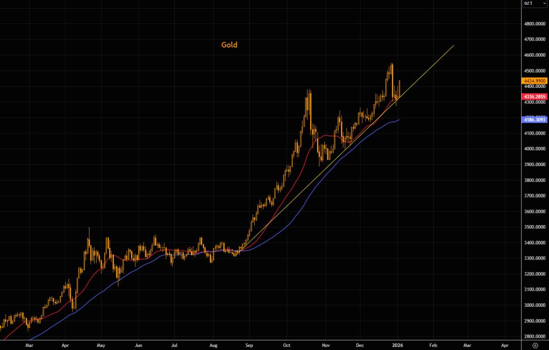2026年开年以来,全球金融市场似乎与2025年的整体格局相比,并未发生太多变化。除了节节攀升的全球股市外,黄金、白银开年也持续大涨,继续延续 着历史性的牛市之旅。 行情数据显示,现货黄金价格在新年首个完整交易周可谓强势开局,周一大幅上涨2.7%,至每盎司4444.52美元,盘中曾触及去年12月29日以来最高,距 离12月26日创下的4550美元的纪录高位并不遥远。 而白银价格自隔夜迄今更是堪称疯狂:现货白银价格在周一一天内就又跳涨了5.1%,周二亚洲时段又飙升逾3%,再度逼近80美元关口。沪银主力合约日 内更是一度暴涨8.00%,现报19452.00元/千克。 许多业内人士目前正将委内瑞拉新年伊始飞出的"黑天鹅",视为金银价格上涨的主要原因,因这再度激发了人们对贵金属等避险资产的需求。 美国上周六突袭委内瑞拉并逮捕了委内瑞拉总统马杜罗,这是美国自1989年入侵巴拿马以来对拉丁美洲进行的最直接干预。美国总统特朗普还警告称,如 果委内瑞拉方面抵制美国开放其石油行业和阻止毒品贩运的努力,将再次发动打击,并暗示可能就非法毒品流动问题对哥伦比亚和墨西哥采取行动。 Heraeus Metals贵金属交易员Alexand ...