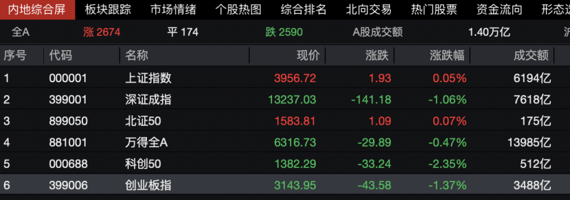 沪指翻红。 A股市场今天(11月3日)上午整体低位震荡,临近上午收盘,上证指数成功翻红。 概念板块方面,煤炭股今天上午大幅上涨,成为A股市场和港股市场主要亮点之一,其中港股飞尚无烟煤领涨,盘中涨幅一度超过180%。此外,核能核 电概念表现强势,多股开盘即涨停,消息面上,我国核能科技领域取得新突破。 沪指翻红 | 内地综合屏 | | 板块跟踪 | | 市场情绪 | 个股热图 | 综合排名 | 北向交易 热门股票 | | 资金流向 形态设 | | --- | --- | --- | --- | --- | --- | --- | --- | --- | --- | | 全A | | 涨 2674 | | 平 174 | | 跌 2590 | A股成交额 | 1.40万亿 | み | | 序号 | 代码 | | 名称 | | | 现价 | 涨跌 | 涨跌幅 | 成交额 | | 1 | 000001 | | 上证指数 | | | 3956.72 | 1.93 | 0.05% | 6194亿 | | 2 | 399001 | | 深证成指 | | | 13237.03 | -141.18 | -1.06% | 7618 ...