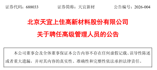 ●由亚化咨询主办的第十二届太阳电池浆料与金属化技术论坛将于2026年3月19日在江苏常州召开 ●由亚化咨询主办的第八届钙钛矿与叠层电池论坛将于2026年4月15-16在常州召开 1月16日,天宜新材发布关于聘任高级管理人员的公告。 杨铠璘女士,1990年10月出生,中国国籍,无境外永久居留权,第九届海淀青联委员,耶鲁大学高级管 理硕士,中国人民大学工商管理硕士。2013年至2015 年,任北京上佳合金有限公司执行董事、总经 理;2013年至2016年,任公司总经理助理;2016年至今,历任公司董事、董事会秘书、副总经理、副董 事长、总裁。 截至本公告披露日,杨铠璘女士直接持有公司0.01%股份,通过上海九太方和信息咨询中心(有限合 伙)间接持有公司0.09%股份,合计持有公司0.10%股份。杨铠璘女士与公司实际控制人、董事长吴佩 芳女士为母女关系,与公司其他5%以上股份的股东、公司其他董事、高级管理人员均不存在关联关 系,不存在《公司法》规定的不得担任公司高级管理人员的情形,不存在被中国证监会确定为市场禁入 者且尚在禁入期的情形,亦不存在被证券交易所公开认定不适合担任上市公司高级管理人员的情形,未 受过中国证 ...