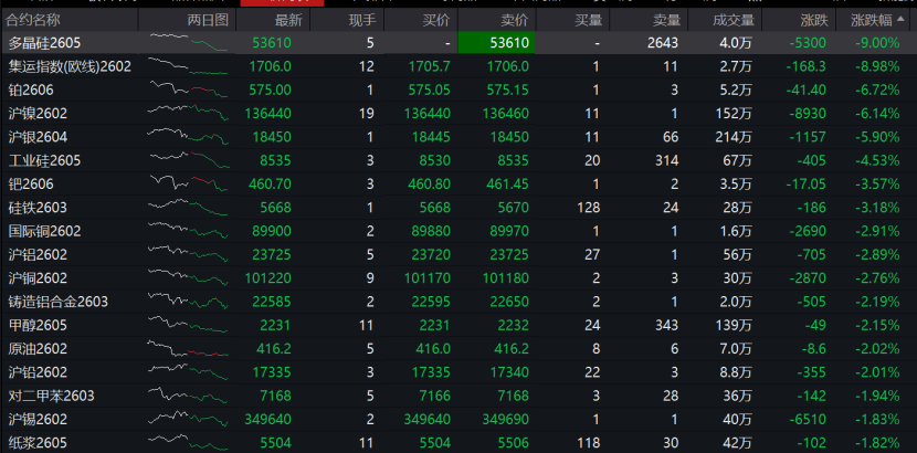 1月8日,有色和贵金属板块出现明显回调迹象。 截至1月8日白天收盘,沪镍2602合约收跌6.14%,前一交易日该合约曾触及涨停板;同样在前一天收涨,沪银期货也 收跌近6%;国际铜、沪铝、沪铜、铸造铝合金、沪铅等期货主力合约均跌超2%;沪锡、氧化铝、沪锌、沪金等同样 收跌。 | 合约名称 | 两日图 | 量新 | 现手 | 买价 | 卖价 | 买量 | 定量 | 成交量 | 涨跌 | 涨跌幅 | | --- | --- | --- | --- | --- | --- | --- | --- | --- | --- | --- | | 多昌硅2605 | | 53610 | ટ | | 53610 | | 2643 | 4.0万 | -5300 | -9.00% | | 集运指数(欧线)2602 | | 1706.0 | 12 | 1705.7 | 1706.0 | | 11 | 2.7万 | -168.3 | -8.98% | | 辑2606 | no | 575.00 | 1 | 575.05 | 575.15 | | 3 | 5.2万 | -41.40 | -6.72% | | 沪镇2602 | manus ...