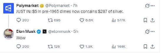 根据社交媒体上的帖子,随着银价飙升至历史新高,美国1965年前铸造的5美元硬币(含银量90%)所 包含的白银价值一度达到287美元。 美股频道更多独家策划、专家专栏,免费查阅>> 马斯克注意到了其中一条帖子,并发出惊叹之声。此前马斯克曾警告银价创纪录飙升将引发工业风险。 责任编辑:栎树 ...