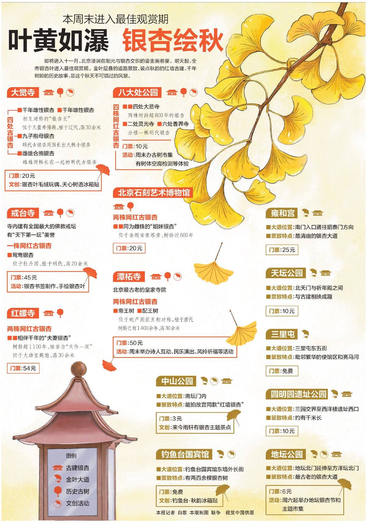 即将进入十一月,北京浸润在阳光与银杏交织的鎏金画卷里。明天起,全市银杏叶进入最佳观赏期。金叶层叠的道路景致、装点秋韵的红墙古建、千年树龄 的历史故事,是这个秋天不可错过的风景。 ■天追位直:钓里台国兵馆乐荷外长街 ■人栏以且· 心石书坛 JSH中土/. 日本国 ■景致特点:最古老的银杏大过 ■景致特点:有两百余棵银杏树 金叶大道 历史古树 门票:免费 门票:6元 活动:周六起举办地坛银杏节 文创:钓鱼台·秋韵冰箱贴 t 文创活动 主题市集 本报记者 白歌 本版制图 耿争 视觉中国供图 ...