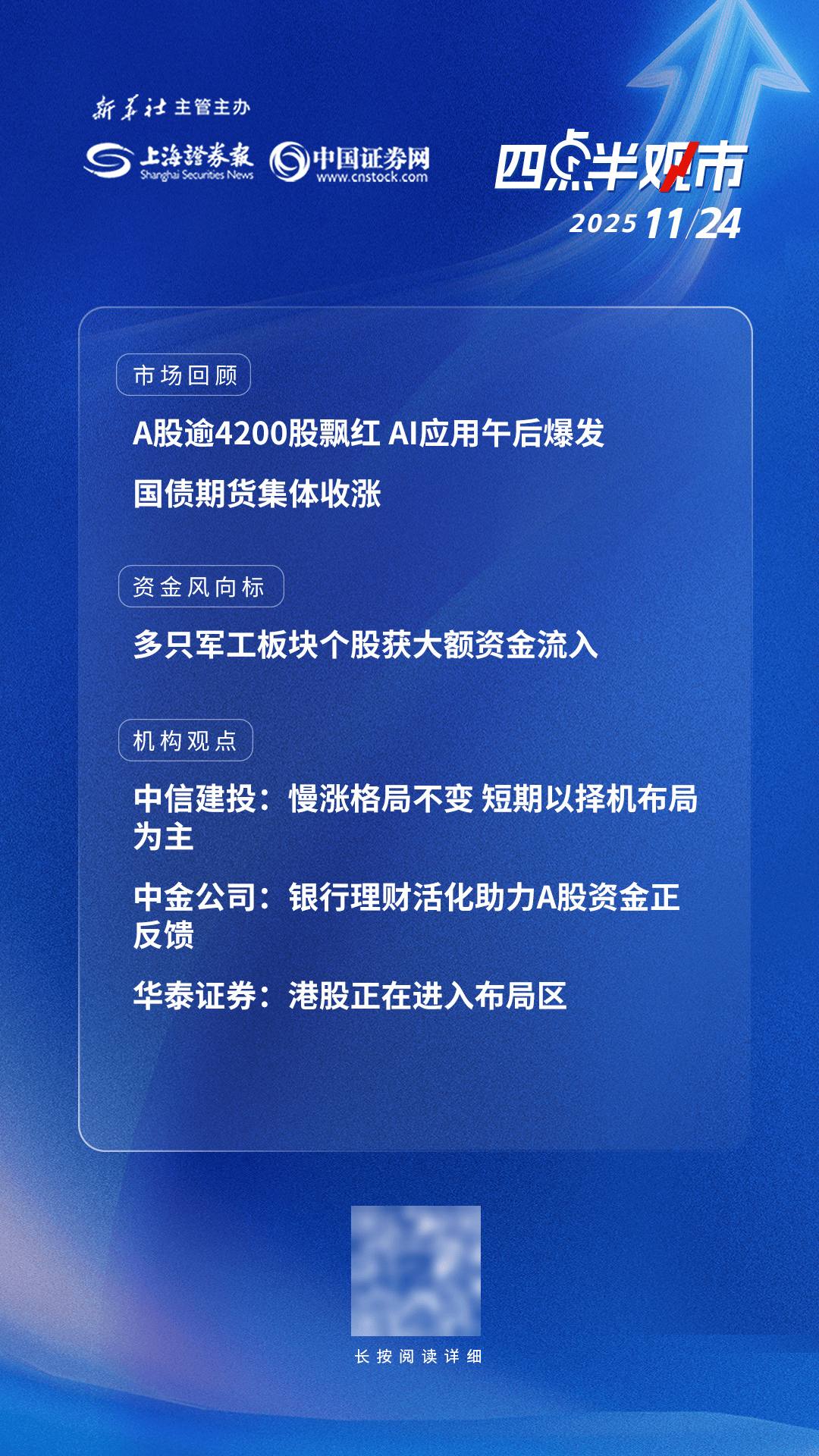 新 3 社 主管主办 上海渗券系 ()中国证券网 四分子又有 2025 11/24 市场回顾 A股逾4200股飘红 Al应用午后爆发 国债期货集体收涨 【市场回顾】 11月24日,A股三大指数集体收涨,截至收盘,上证指数涨0.05%,深证成指涨0.37%,创业板指涨0.31%。沪深北三市全天成交17403亿元,较上日缩量 2433亿元。全市场超4200只个股上涨。 11月24日,韩国综合指数收跌0.19%,报3846.06点,能源、零售类个股跌幅较前。盘中该指数一度涨超1.5%。日本股市今日因假期休市一日。 资金风向标 多只军工板块个股获大额资金流入 机构观点 中信建投:慢涨格局不变 短期以择机布局 为主 中金公司:银行理财活化助力A股资金正 反馈 华泰证券:港股正在进入布局区 中信建投发布报告称,当前市场处于"三期叠加":上涨行情中段整固期、景气验证关键期和业绩政策空窗期,市场震荡轮动和资金年底止盈等特征也会进 一步放大。长期而言,慢涨格局的主要因素不变;短期来看,策略层面以择机布局为主,关注60日线与半年线支撑和市场缩量情况。行业重点关注:银 行、石油石化、钢铁、农林牧渔、锂电、新材料等。 中金公司研报表 ...