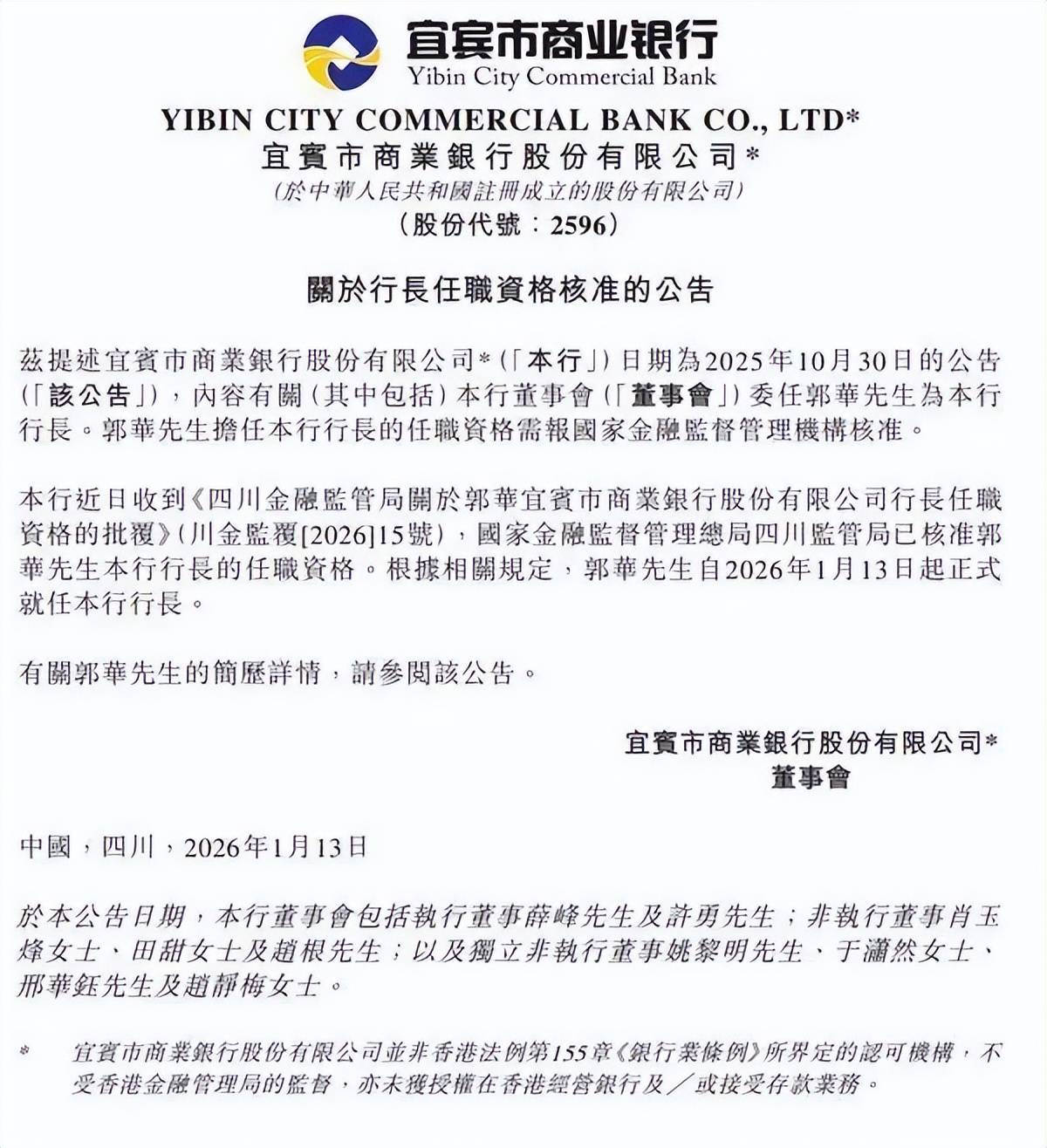 Group 1 - Yibin Bank has appointed Guo Hua as the new president, effective January 13, 2026, following approval from the Sichuan Regulatory Bureau of the National Financial Supervision Administration [1] - The leadership transition marks the establishment of a core management team led by "post-70s" chairman Xue Feng and new president Guo Hua, coinciding with the one-year anniversary of Yibin Bank's listing on the Hong Kong Stock Exchange [1] - Guo Hua, aged 54, has extensive banking management experience, having held various positions in China Construction Bank and Sichuan Bank, focusing on retail finance and corporate business [1][4] Group 2 - Yibin Bank's board approved Guo Hua's appointment as president and executive director on October 30, 2025, filling the position left vacant by Jiang Lin, who resigned for personal reasons [5] - Established in December 2006, Yibin Bank is a local joint-stock commercial bank with a registered capital of 4.5884 billion yuan and is known for its significant shareholding by Wuliangye [5] - As of the first half of 2025, Yibin Bank reported operating income of 1.168 billion yuan, an 8.3% year-on-year increase, and a net profit of 285 million yuan, remaining stable compared to the previous year [7] Group 3 - The bank's total assets reached 113.23 billion yuan, a 3.7% increase from the beginning of the year, with net loans and advances of 63.091 billion yuan, up 8% [7] - Customer deposits totaled 92.226 billion yuan, reflecting a 9.1% increase since the start of the year [7] - The bank's net interest income for the first half of 2025 was 935 million yuan, a 12.9% increase, accounting for 80% of total operating income, although net interest margin and net interest spread decreased compared to the previous year [7]