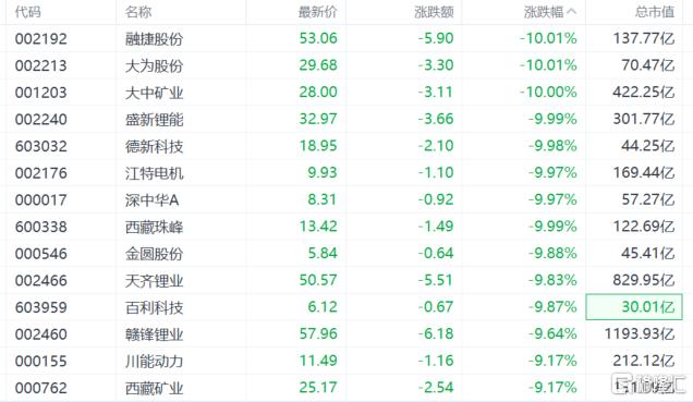 碳酸锂价从10万元高位惊魂跳水,扬眉吐气一阵的锂矿股陷入持续大回调。 周一,能源金属板块下挫,锂矿股连续第三日走低。 截至发稿,A股融捷股份、大为股份、大中矿业、盛新锂能、江特电机等跌停,天齐锂业、赣锋锂业、西藏矿业、西藏珠峰等大超9%。 | 代码 | 名称 | 最新价 | 涨跌额 | 涨跌幅 ^ | 总市值 | | --- | --- | --- | --- | --- | --- | | 002192 | 融捷股份 | 53.06 | -5.90 | -10.01% | 137.77 Z | | 002213 | 大为股份 | 29.68 | -3.30 | -10.01% | 70.47亿 | | 001203 | 大中矿业 | 28.00 | -3.11 | -10.00% | 422.25 Z | | 002240 | 盛新理能 | 32.97 | -3.66 | -9.99% | 301.77 亿 | | 603032 | 德新科技 | 18.95 | -2.10 | -9.98% | 44.25亿 | | 002176 | 江特电机 | 9.93 | -1.10 | -9.97% | 169.4 ...