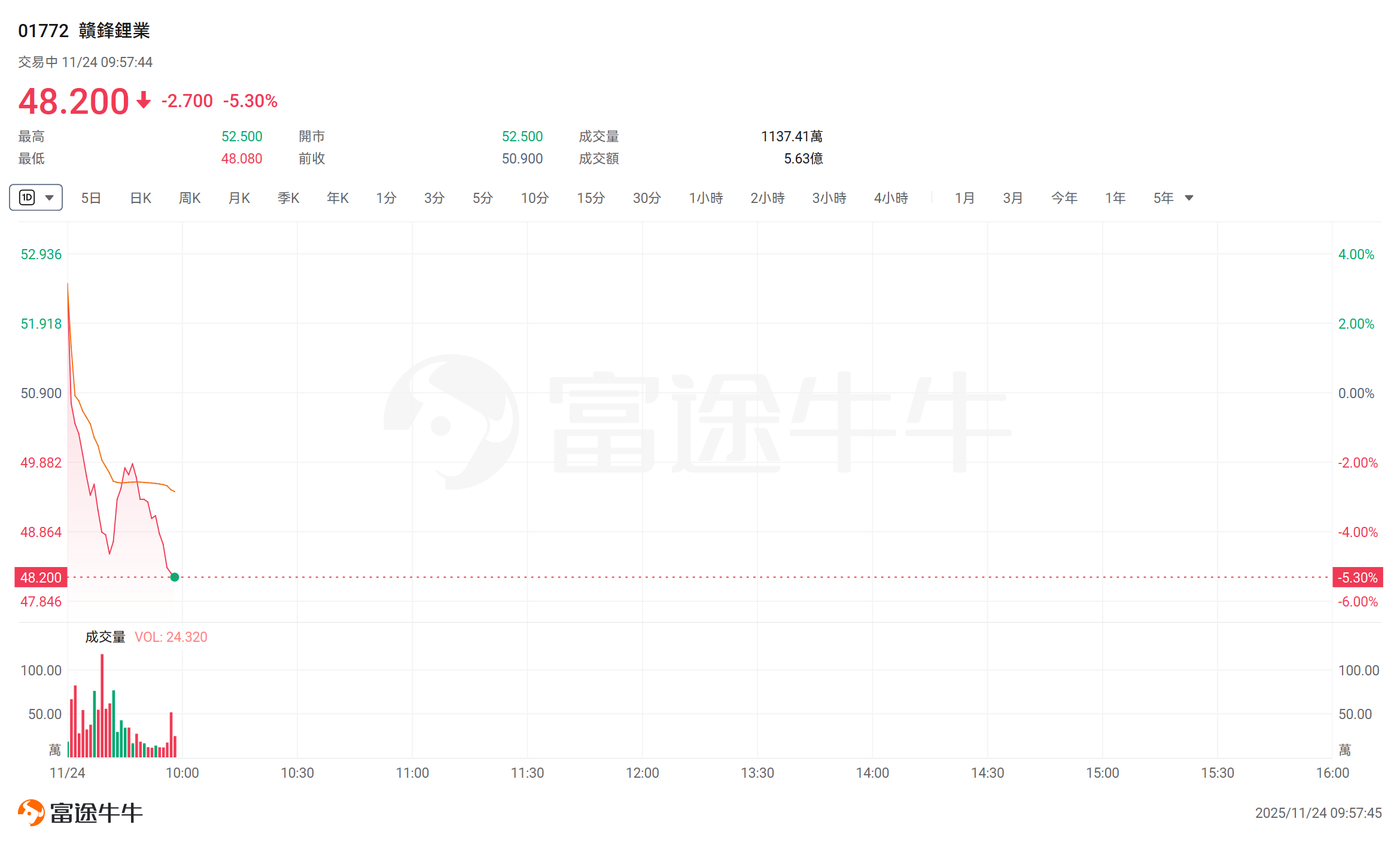 高盛将赣锋锂业H股的评级从"中性"下调至"卖出",理由是下游市场短期反馈欠佳以及补库存增速放缓,导致锂现货价格面临下行风险。该行预测,全球锂 产能在2025年下半年相对需求将出现12%的短缺,但到2026年下半年将转为10%的过剩。 今日,港股"锂电双雄"下跌,跌超5%, 跌超4%。 01772 赣锋鋰業 交易中 11/24 09:57:44 48.200 + -2.700 -5.30% 最高 52.500 52.500 成交量 開市 48.080 前收 50.900 成交額 最低 5日 日K 周K 月K 季K 1分 3分 5分 10分 15分 30关 (1D) ▼ 年K 52.936 51.918 50.900 49.882 48.864 48.200 47.846 成交量 VOL: 24.320 100.00 50.00 国邮 11/24 10:30 11:30 12:00 11:00 10:00 分富途牛牛 交易中 11/24 09:57:53 45 ↓ -1.940 -4.11% 09696 天齊鋰業 高盛指出,大多数中国锂业股票的当前估值已经消化了每吨1.62万至2.45万美元的锂价区间。这一价格区 ...