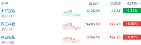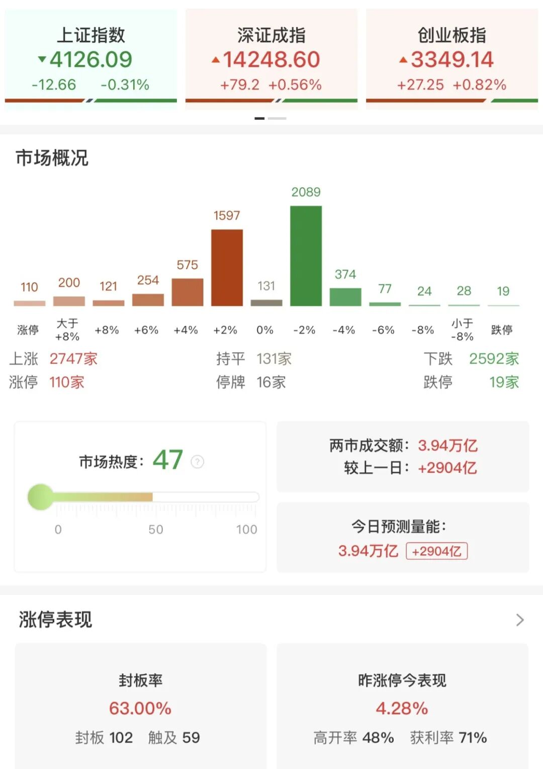 截至收盘,沪指跌0.31%,深成指涨0.56%,创业板指涨0.82%。 下跌方面,能源金属、保险、银行等板块跌幅居前。其中锂矿概念下挫,国城矿业(000688)触及跌停。 上证指数 深证成指 创业板指 ▼4126.09 -3349.14 -14248.60 -12.66 -0.31% +79.2 +0.56% +27.25 +0.82% 市场概况 2089 1597 575 374 254 200 121 110 131 77 24 28 19 小手 大于 涨停 -2% -6% -8% 跌停 +8% +6% +4% +2% 0% -4% -8% +8% 上涨 2747家 持平 131家 下跌 2592家 涨停 110家 停牌 16家 跌停 19家 两市成交额:3.94万亿 较上一日: +2904亿 今日预测量能: 3.94万亿 +2904亿 涨停表现 市场冲高回落,沪指午后快速翻绿,此前一度涨超1%。沪深两市成交额3.94万亿,较上一个交易日放量2904亿,连续第3个交易日突破3.5万亿。 盘面上,市场热点快速轮动,全市场超2700只个股上涨。从板块来看,AI应用概念爆发,二十余只成分股涨停,利欧股份(002 ...