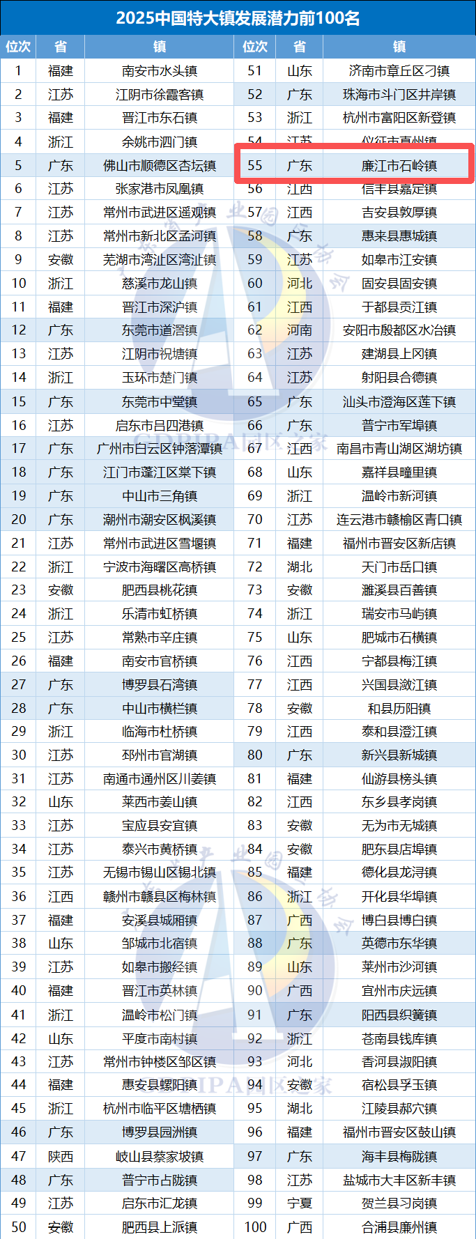| | | | 2025中国特大镇发展潜力前100名 | | | | --- | --- | --- | --- | --- | --- | | 位次 | 省 | 慎 | 位次 | 省 | 镇 | | 1 | 福建 | 南安市水头镇 | 51 | 山东 | 济南市章丘区刁镇 | | 2 | 江苏 | 江阴市徐霞客镇 | 52 | 广东 | 珠海市斗门区井岸镇 | | 3 | 福建 | 晋江市东石镇 | ਦੇਤੋ | 浙江 | 杭州市富阳区新登镇 | | 4 | 浙江 | 余姚市泗门镇 | Հ / | 工事 | 八江古直州镇 | | 5 | 广东 | 佛山市顺德区杏坛镇 | ટર | 广东 | 廉江市石岭镇 | | 6 | 江苏 | 张家港市凤凰镇 | 56 | 江西 | 信丰县嘉定镇 | | 7 | 江苏 | 常州市武进区遥观镇 | 1576 | 江西 | 吉安县敦厚镇 | | 8 | 江苏 | 常州市新北区孟河镇 | 28 | 广东 | 惠来县惠城镇 | | g | 安徽 | 芜湖市湾汕区湾汕镇 | ਟਰੇ | 江苏平 | 如皋市江安镇 | | 10 | 浙江 | 慈溪市龙山镇 | 60 | 河北 245 ...