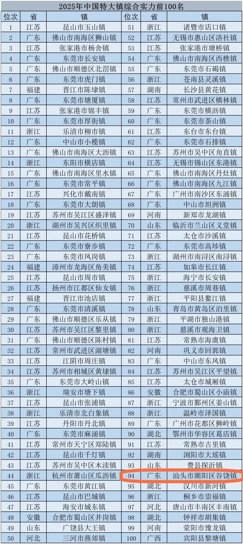 转自:汕头发布 近日,全国特大镇研究课题组联合千强瞪羚企业认证咨询中心等机构发布了最新镇域经济研究成果《中国特大镇研究报告2025》(以下简称"《报 告》")。《报告》同步发布了"2025年中国特大镇综合实力前100名""2025年中国特大镇发展潜力前100名"等2份榜单。 汕头市潮阳区谷饶镇上榜 "2025年中国特大镇综合实力前100名" 第94名 汕头市澄海区莲下镇上榜 "2025年中国特大镇发展潜力前100名" 澄海区莲下镇 | | | | 2025年中国特大镇综合实力前100名 | | | | --- | --- | --- | --- | --- | --- | | 位次 | 省 | 賃 | 位次 | 省 | सेन | | 1 | 江苏 | 昆山市玉山镇 | 51 | 浙江 | 诸暨市店口镇 | | 2 | 厂 东 | 佛山市南海区狮山镇 | 52 | 江苏 | 无锡市惠山区洛社镇 | | 3 | 江苏 | 张家港市杨舍镇 | 53 | 江苏 | 张家港市塘桥镇 | | 4 | 厂东 | 东莞市长安镇 | 54 | 广东 | 佛山市南海区西樵镇 | | 5 | 厂东 | 佛山市顺德区北滘镇 | 5 ...