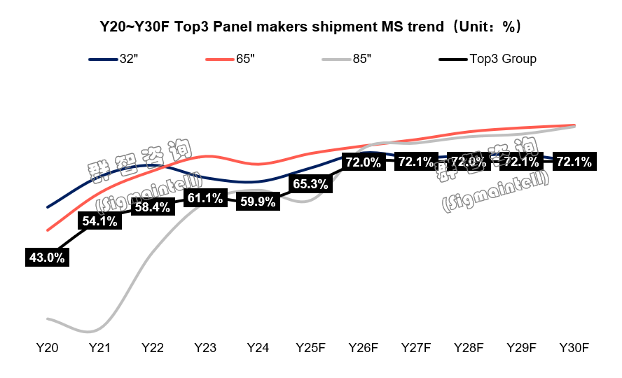 锚点二:2026年电视面板折旧完成比例有望突破50%,未来三年主流尺寸成本竞争力预计加速提升 智通财经APP获悉,群智咨询(Sigmaintell)10月14日发文称,着眼当下,随着面板厂商策略从"以产定销"转向"以销定产",全球 LCD TV面板市场进入良性利润循环周期。放眼未来,群智咨询认为,电视面板市场的四大锚点,是产业践行"长期主义",即 实现稳定获利的核心要义。 锚点一:2026年起头部厂商份额预计稳定在70%以上,"马太效应"为电视面板稳健运营打下基石 近十年来,是全球LCD TV面板产能高度向中国大陆聚集,并形成了以BOE和TCL CSOT为首的双巨头竞争格局的十年。步入 2025年,这一趋势在TCL CSOT并购LGD广州产线以及BOE入股CHOT等事件推动下更加凸显。群智咨询测算数据显示,2025 年TCL CSOT在t11产能加持下市场份额从20%增加到24%,预计未来产能效率提升后份额有望超过25%;与此同时,如将BOE入 股CHOT看作经营共同体,则2026年BOE系份额将从26%跃升至32%。由此,头部三家面板厂商LCD TV面板份额预计从2026年 开始长期稳定在72%左右高位水平 ...