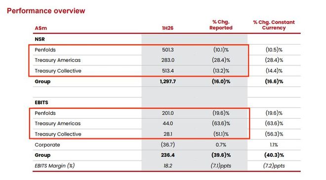 | ASm | 1H26 | % Chg. Reported | % Chq. Constar Currency | | --- | --- | --- | --- | | NSR | | | | | Penfolds | 501.3 | (10.1)% | (10.5)% | | Treasury Americas | 283.0 | (28.4)% | (28.4)% | | Treasury Collective | 513.4 | (13.2)% | (14.4)% | | Group | 1,297.7 | (16.0)% | (16.6)% | | EBITS | | | | | Penfolds | 201.0 | (19.6)% | (19.6)% | | Treasury Americas | 44.0 | (63.6)% | (63.6)% | | Treasury Collective | 28.1 | (51.1)% | (56.3)% | | Corporate | (36.7) | 0.7% | 1.1% | | Group | 236.4 | (39.6)% | (40.3)% ...