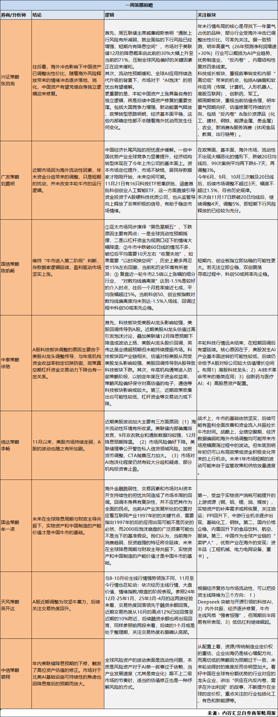 本周各家券商策略分析师的观点较为一致。整体看反弹,引发上周股指调整的多重因素在周末都有了好转。 兴证策略张启尧团队称,海外冲击影响下中国资产已调整出性价比,随着海外风险释放带来的情绪冲击逐步落地、消化,中国资 产有望凭借自身独立逻辑迎来修复。 首先,周五联储主席威廉姆斯表明"通胀上行风险有所减弱,就业面临的下行风险已经增强,短期内有降息空间",市 场对于美联储12月的降息概率由此前的30%大幅上升至当前的71%,压制全球风险偏好的关键因素正在迎来缓和。 其次,流动性预期缓和、全球AI应用持续迭代升级的背景下,市场对于"AI泡沫"的担忧也有望缓解。 更重要的是,本轮中国资产上涨具备自身的独立逻辑,将是后续中国资产修复的重要支撑。包括大国竞争力增强、新 动能景气释放、政策转型思路明朗、经济基本面平稳,这些内部确定性都不会随着海外扰动而发生任何变化。 | 类别 | 汇寿Al基础设施可持续性的焦虑也 因降息推后的预期而放大。 | | --- | --- | | | 解风险的方式。 求在外出利润"的故事,不断提升在全 | | | 球的定价权,重点关注的行业包括化工 | | | 有色和新能源等。 | | | 来源:内容汇 ...