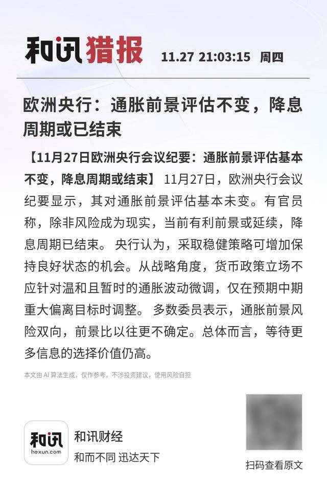 本文由 Al 算法生成,仅作参考,不涉投资建议,使用风险自担 和讯财经 和而不同 迅达天下 【11月27日欧洲央行会议纪要:通胀前景评估基本不变,降息周期或结束】11月27日,欧洲央行会议纪 要显示,其对通胀前景评估基本未变。有官员称,除非风险成为现实,当前有利前景或延续,降息周期 已结束。 央行认为,采取稳健策略可增加保持良好状态的机会。从战略角度,货币政策立场不应针对 温和且暂时的通胀波动微调,仅在预期中期重大偏离目标时调整。 多数委员表示,通胀前景风险双 向,前景比以往更不确定。总体而言,等待更多信息的选择价值仍高。 本文由 AI算法生成,仅作参考,不涉投资建议,使用风险自担 和讯猎报 11.27 21:03:15 脚 欧洲央行:通胀前景评估不变,降息 周期或已经京 【11月27日欧洲央行会议纪要:通胀前景评估基本 不变,降息周期或结束】 11月27日,欧洲央行会议 纪要显示,其对通胀前景评估基本未变。有官员 称,除非风险成为现实,当前有利前景或延续,降 息周期已结束。央行认为,采取稳健策略可增加保 持良好状态的机会。从战略角度,货币政策立场不 应针对温和且暂时的通胀波动微调,仅在预期中期 重大偏离目标 ...